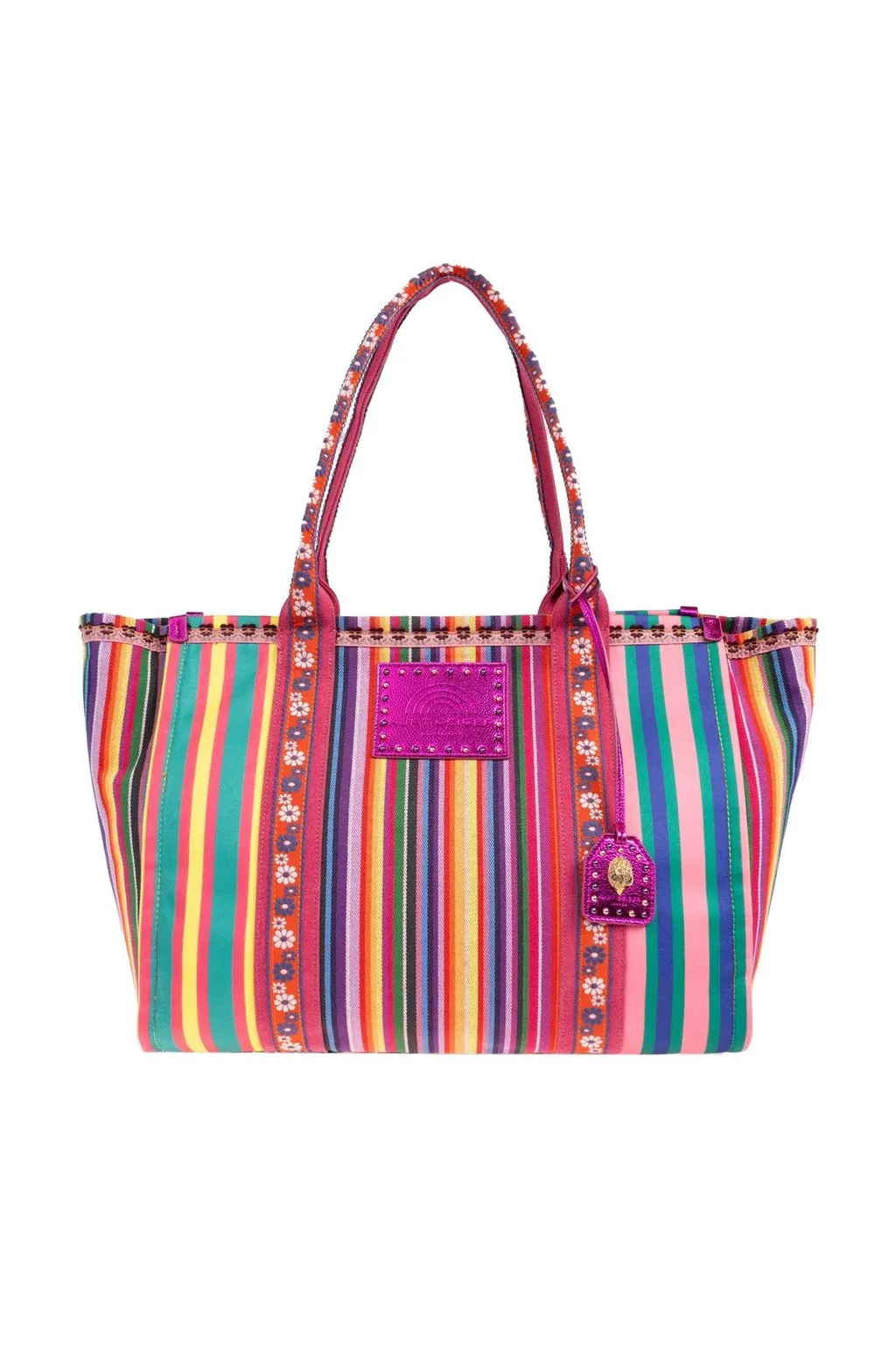 A tote bag with a striped pattern. It has two shoulder straps and a decorative tag attached to one of the straps. The bag also features a decorative trim along the top edge and a central square patch with embossed detailing.
