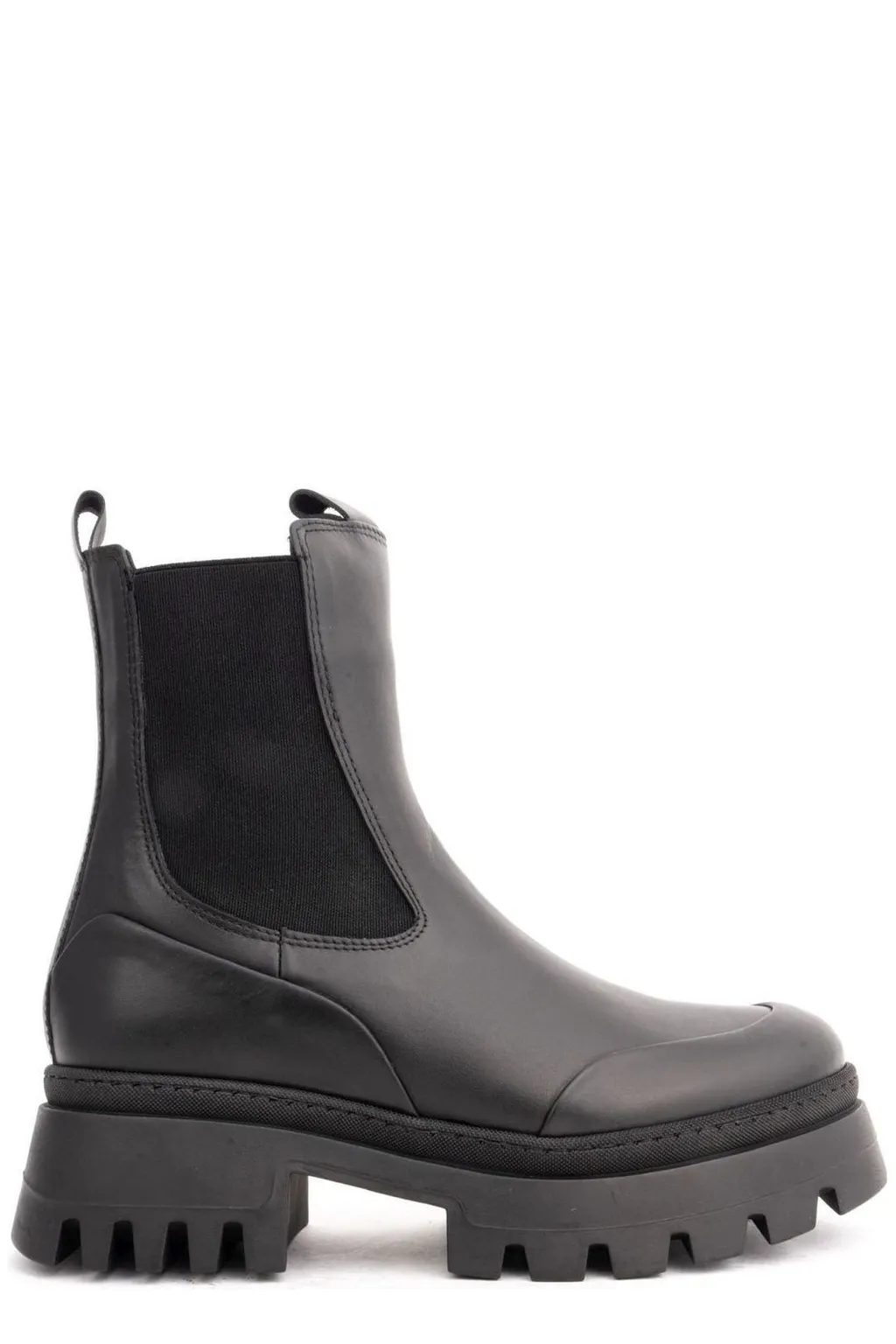 Black leather chelsea boots with elasticated side panels and a chunky lug sole. Features a rounded toe and pull tabs at the heel and front.