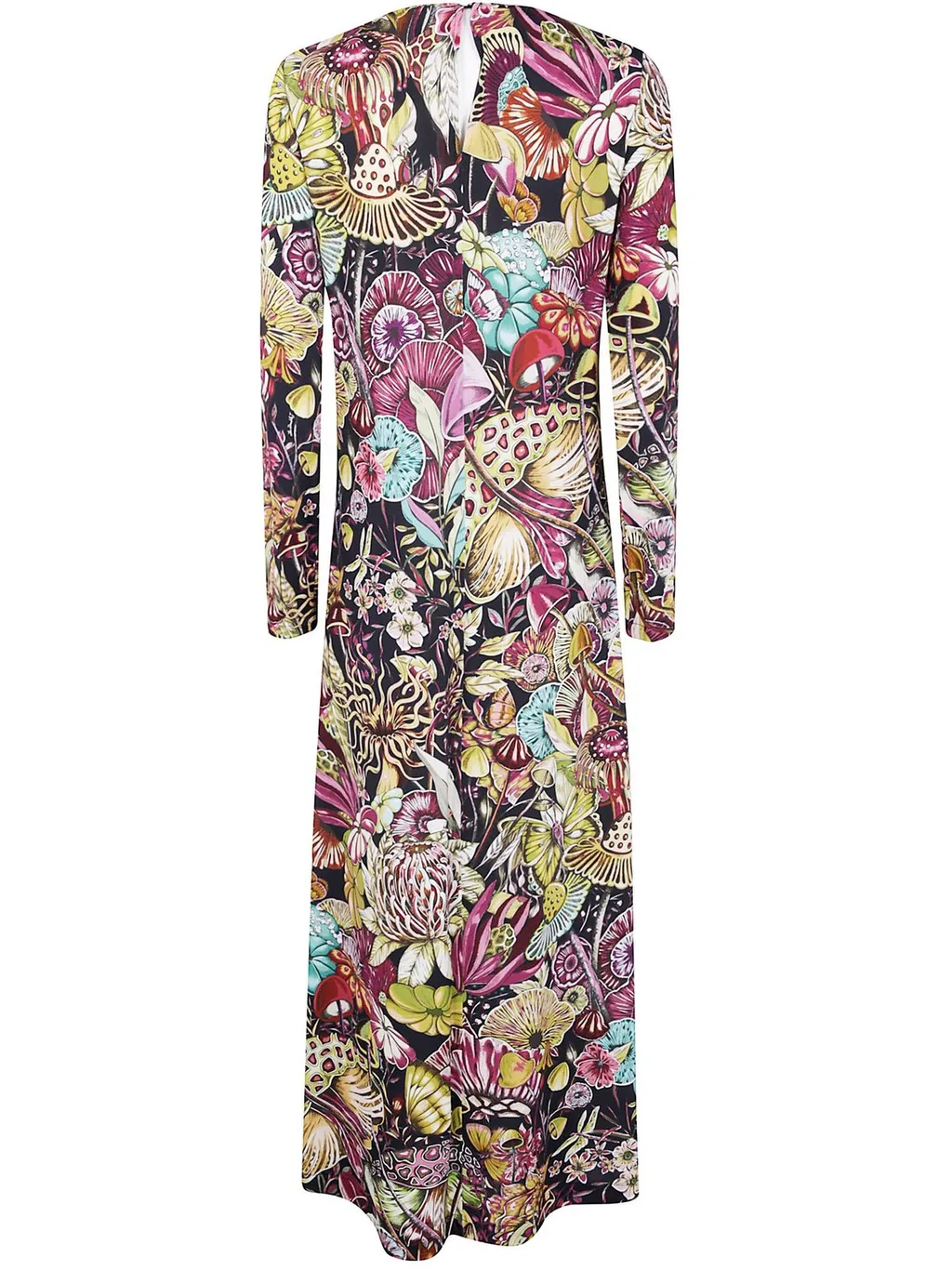 A long-sleeved maxi dress with a vibrant, abstract floral and mushroom print. The dress features a round neckline and a relaxed, flowing silhouette.