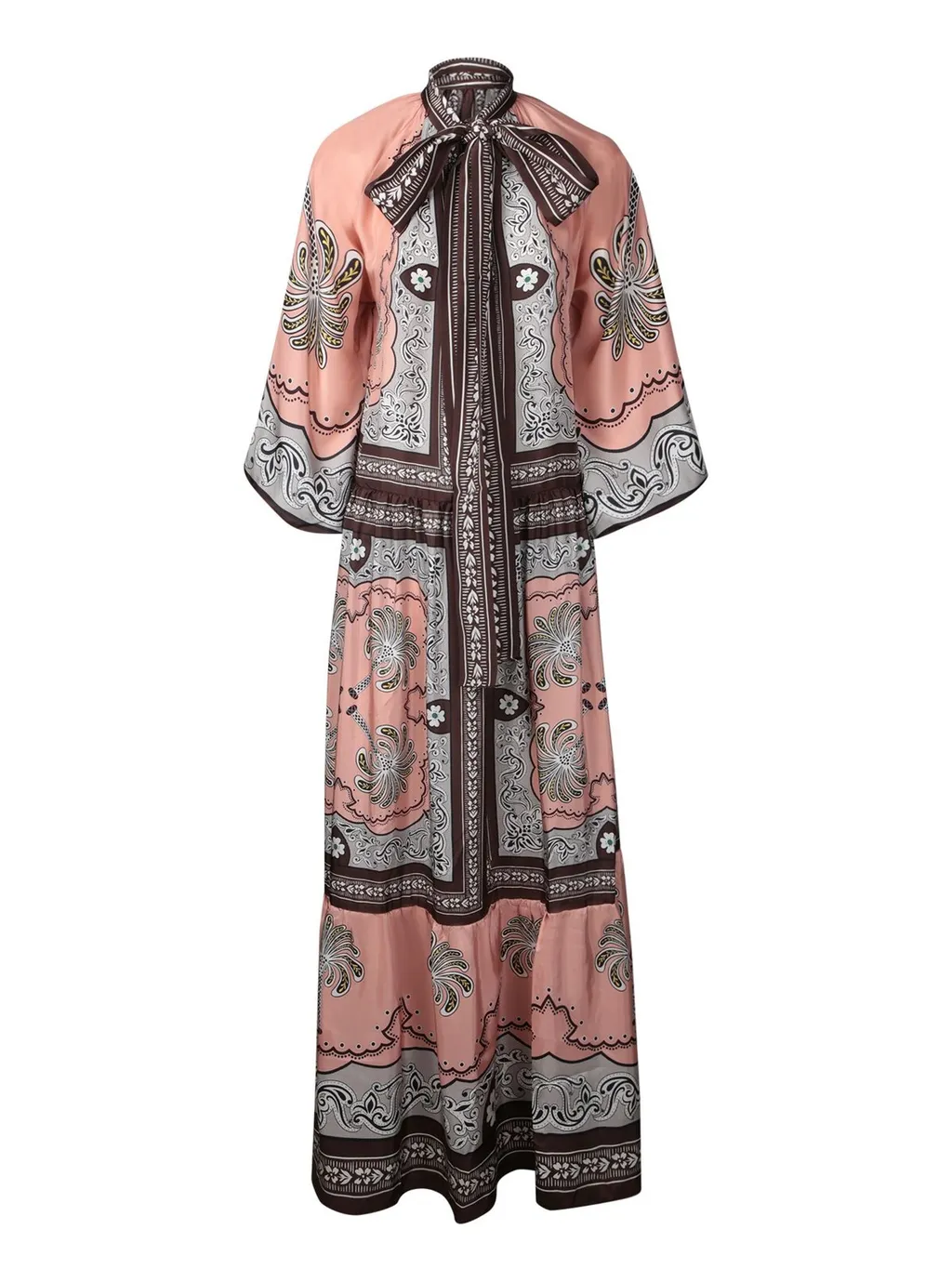 DescriptionA long, flowing maxi dress with a high neckline and a large bow tie at the neck. The dress features wide, bell-shaped sleeves and a tiered skirt. It is adorned with a bold, ornate print in shades of pink, brown, grey, and white, creating a striking geometric and floral pattern. The dress has a relaxed fit and falls to the ankle.