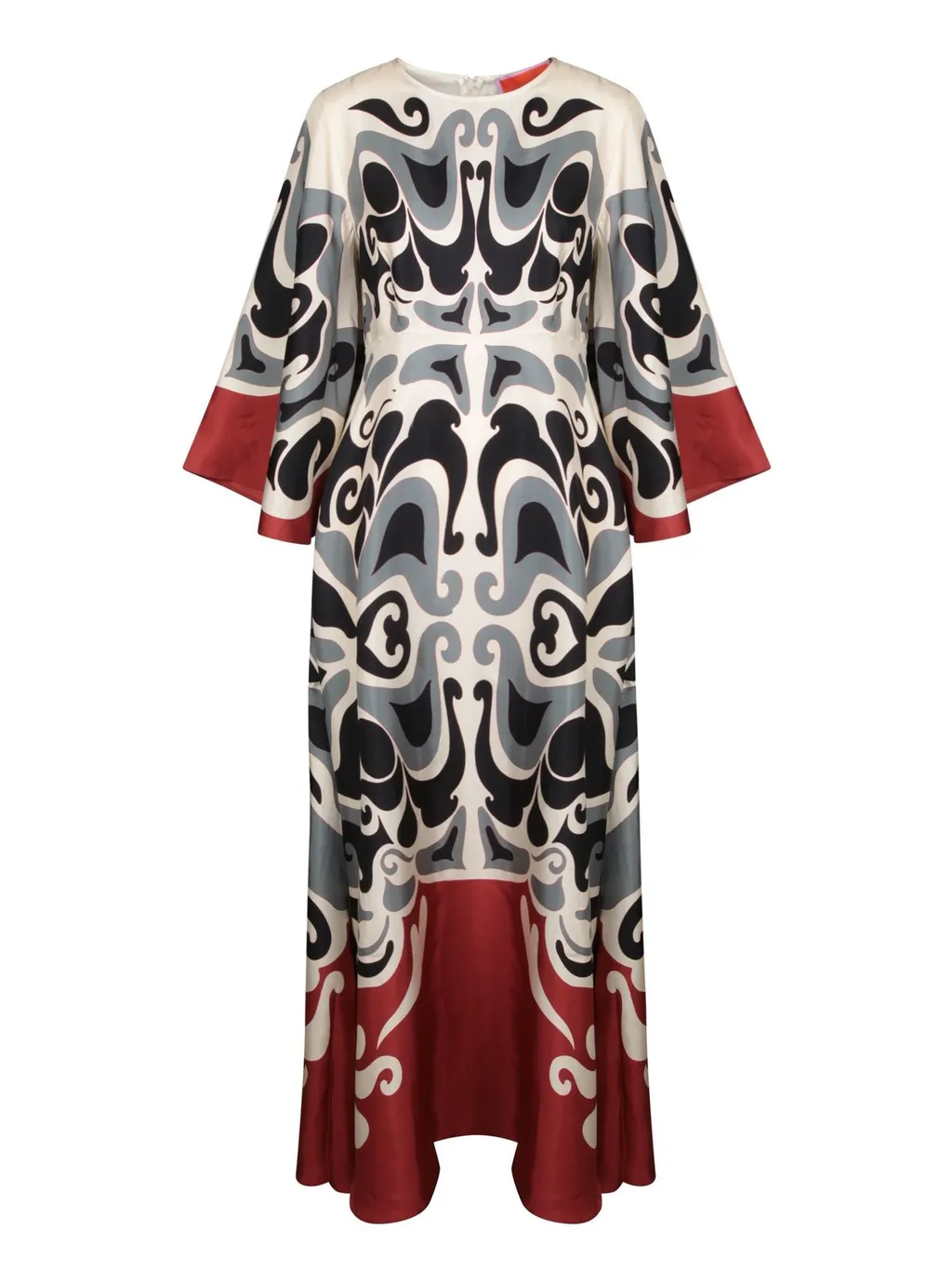 DescriptionA long, flowing maxi dress with a striking, abstract pattern. The dress features wide, kimono-style sleeves and a high neckline. The hemline is accented with a solid red band, mirroring the cuffs of the sleeves. The back of the dress has a concealed zipper closure.