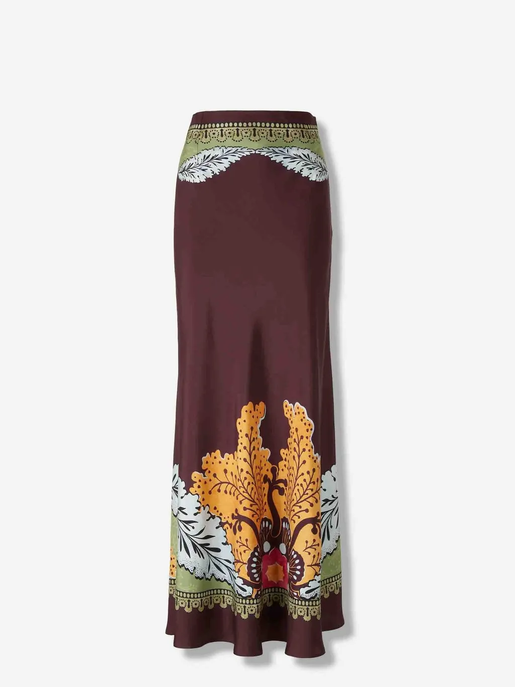 DescriptionA long, flowing skirt with a rich brown base. It features a vibrant, ornate pattern with yellow, green, and white accents. The pattern is reminiscent of paisley or floral motifs, with intricate detailing and a bohemian aesthetic. The skirt has a high waist and a floor-length hemline.