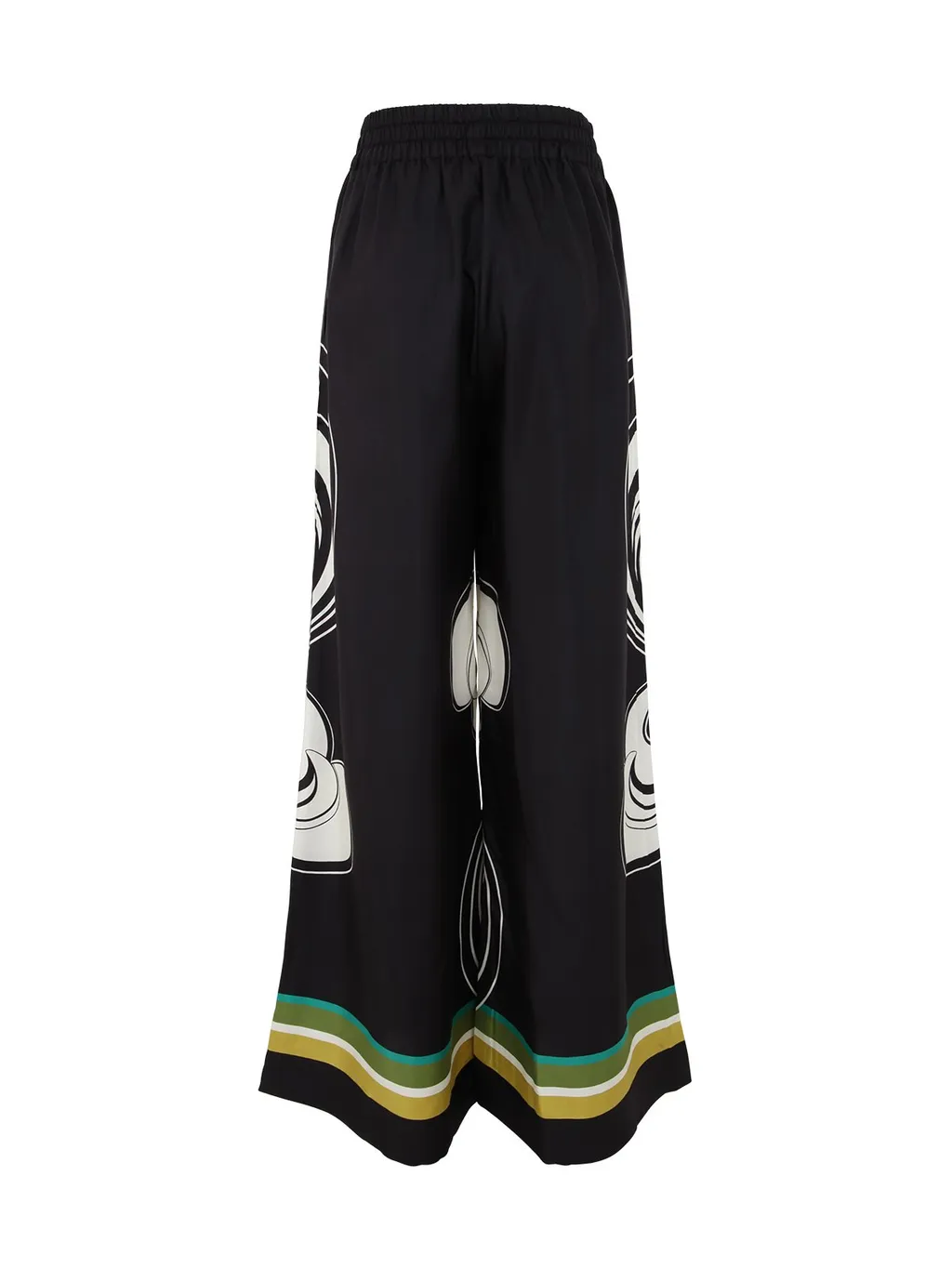 High-waisted palazzo pants with a wide leg and an elasticated waistband. The pants feature a bold, abstract graphic print in white and black, with a striped trim at the hem in green, yellow, and white.