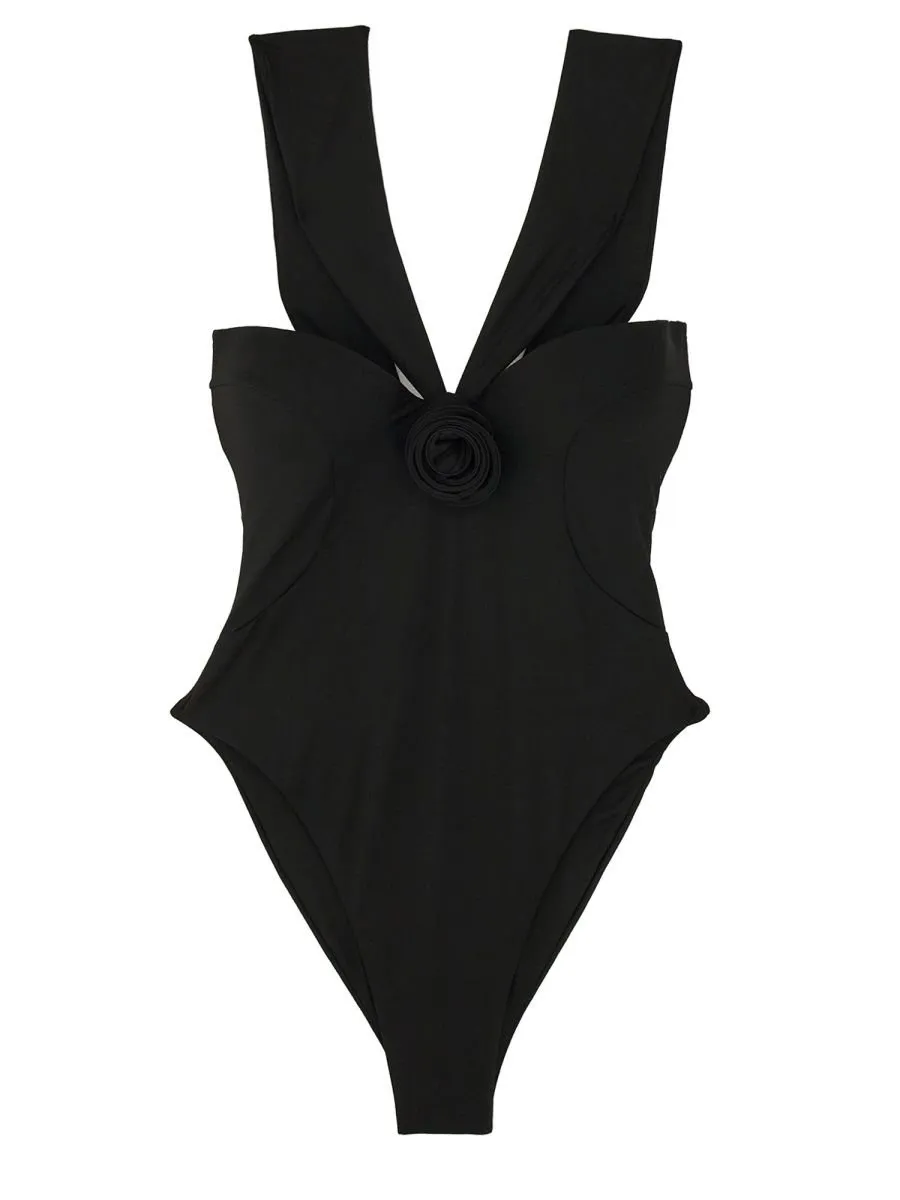 A black one-piece swimsuit with a plunging v-neckline and wide shoulder straps. The swimsuit features a decorative rose detail at the bust. It has a high-cut leg and a seamless back.