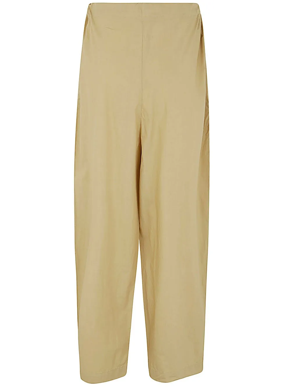 These trousers feature a wide-leg silhouette with a relaxed fit. They have a drawstring waist for adjustable comfort and side pockets for practicality. The fabric has a subtle sheen and drapes fluidly.