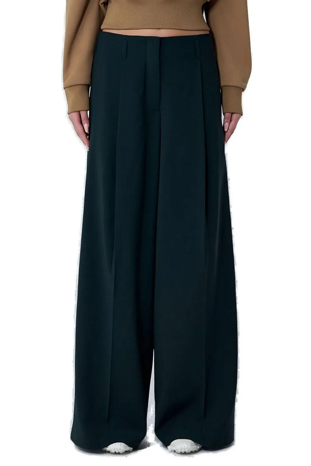 DescriptionHigh-waisted, wide-leg trousers with a relaxed fit. Features a flat front with subtle pleating that creates volume and a flowing silhouette. The trousers have a concealed zip closure and belt loops. The hem is wide and falls straight to the floor.