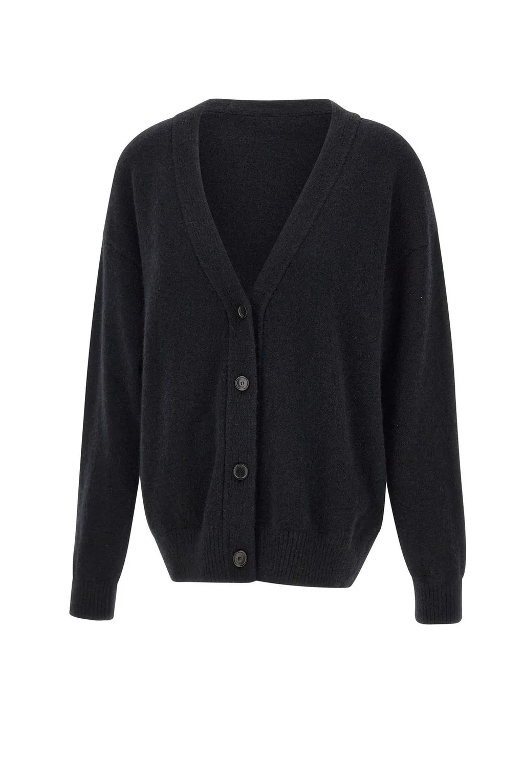 A classic black v-neck cardigan with a button-up front. It features long sleeves and ribbed cuffs and hem. The fit is relaxed and slightly oversized.