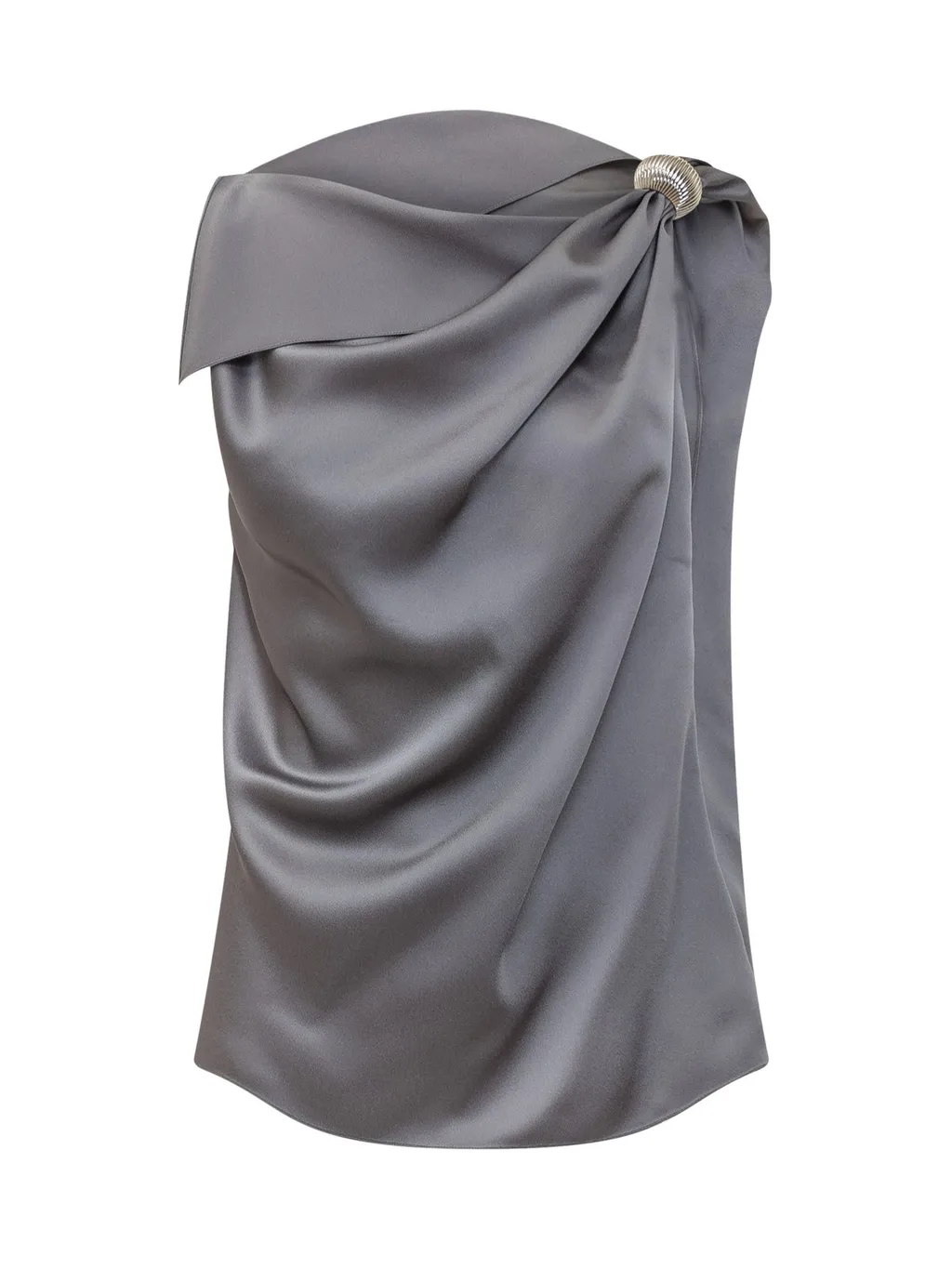 A grey, strapless, one-shoulder top with a draped effect. It features a ruched detail on the shoulder secured with a decorative, circular embellishment.