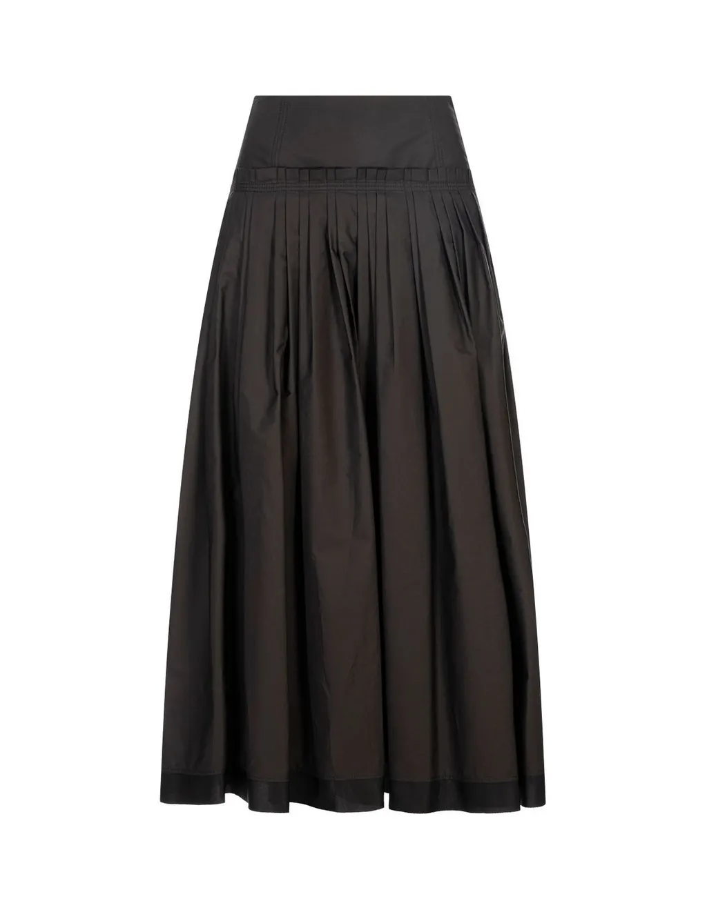 A black maxi skirt with a high waist and a pleated a-line silhouette. The skirt features a structured waistband and a full, flowing skirt that reaches the ankle. It has a concealed side zip closure.