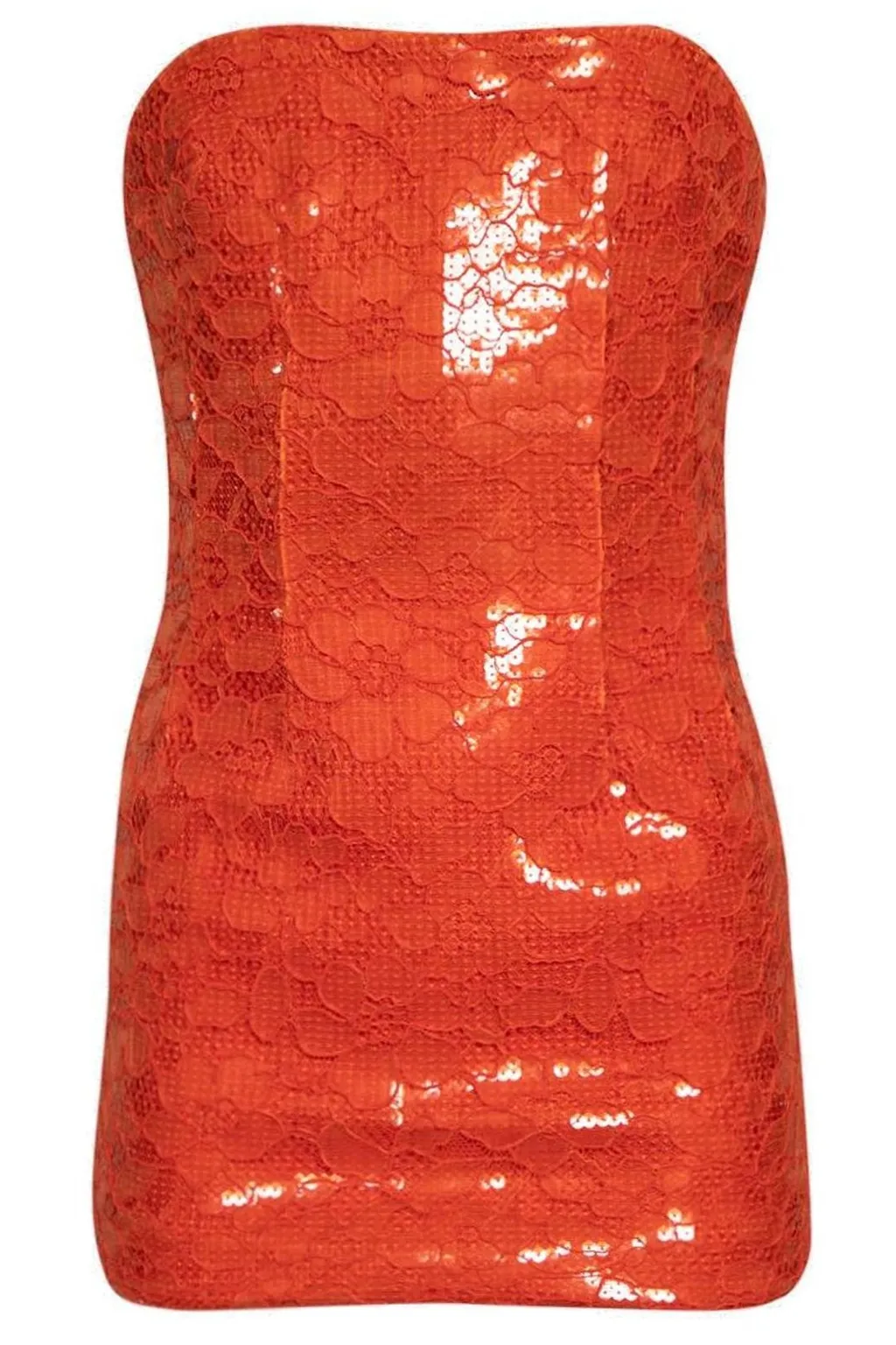 A strapless, mini-length dress with a bodycon silhouette. The dress is covered in sequins and features a lace overlay.