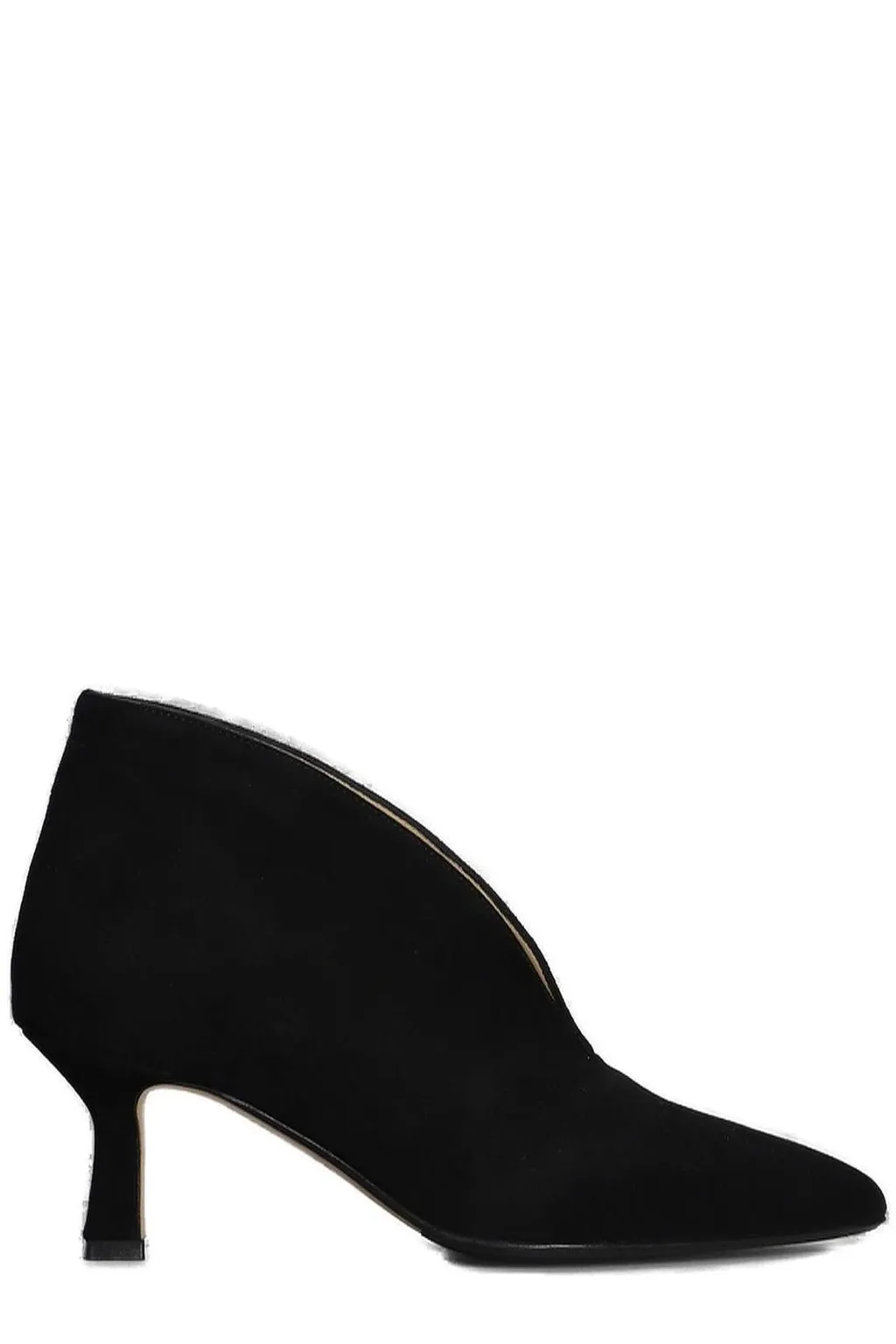 Black suede ankle boots with a pointed toe and a v-shaped cut-out at the ankle. Features a low kitten heel.
