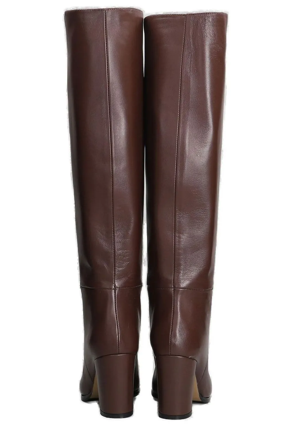 These are brown, knee-high boots with a pointed toe and a block heel. The boots appear to be made of leather.