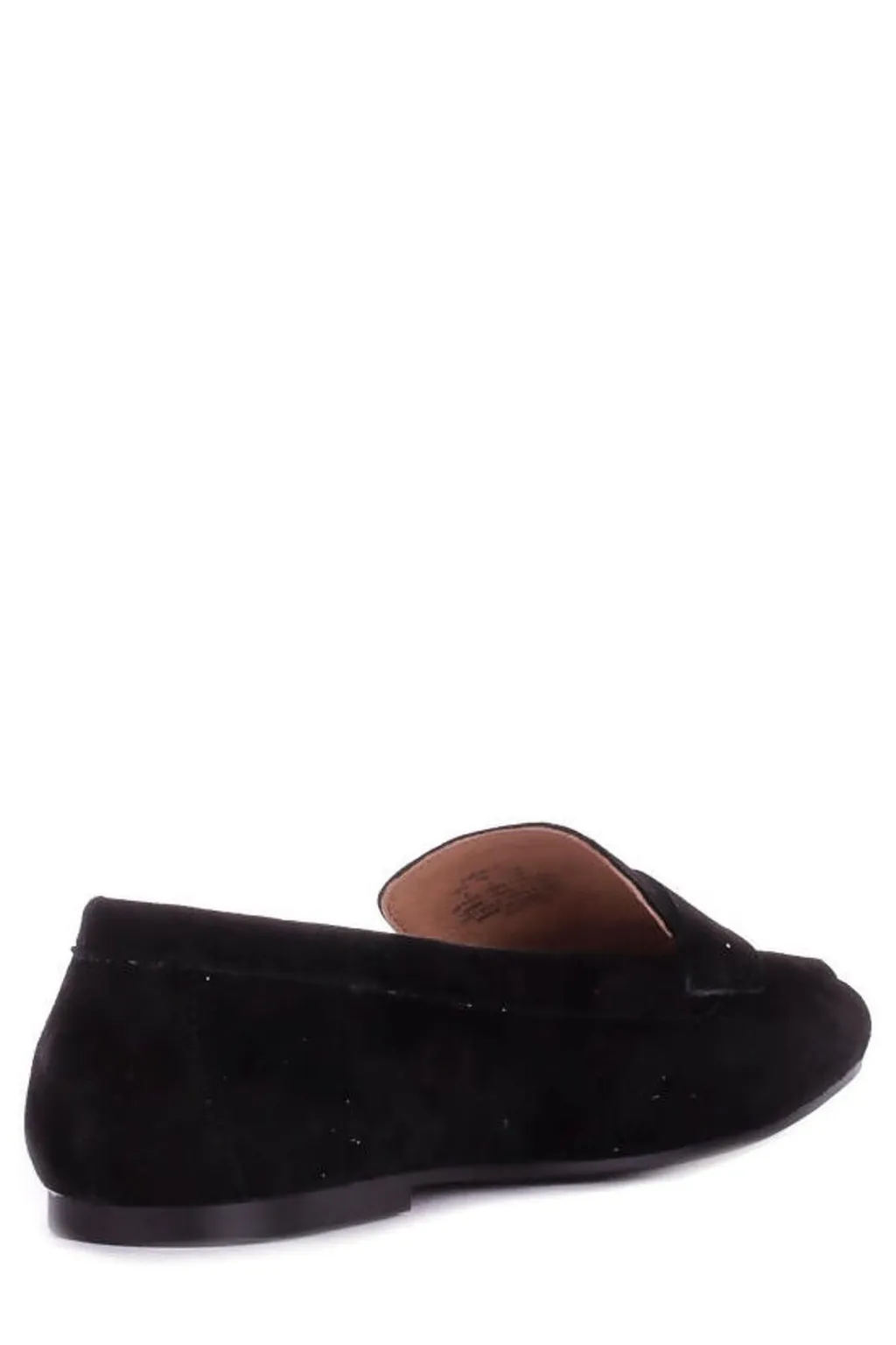 A pair of black suede loafers with a pointed toe and a gold-tone buckle detail across the vamp. The shoes have a flat sole and a low heel.