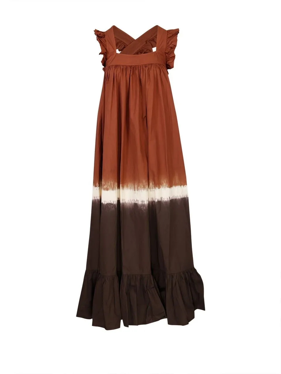 A maxi dress with a square neckline, criss-cross straps, and ruffled cap sleeves. The dress features a tiered skirt with ruffles at the hem. The fabric has a tie-dye effect with horizontal bands of brown, white, and a darker brown.