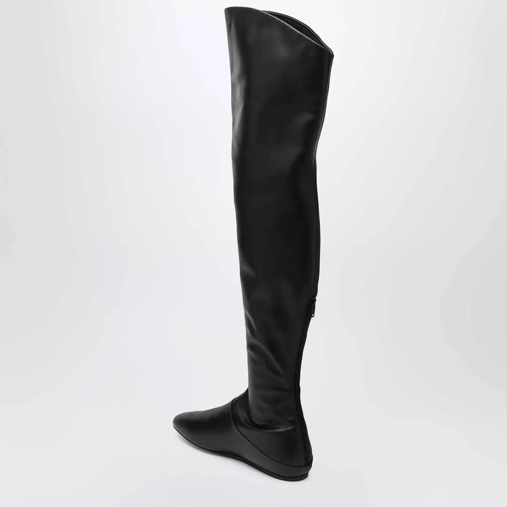 These are black, over-the-knee boots made of leather. They feature a pointed toe and a flat sole. A zipper is present on the inner side of the shaft for closure. The shaft is designed to be slightly slouchy and reaches above the knee.