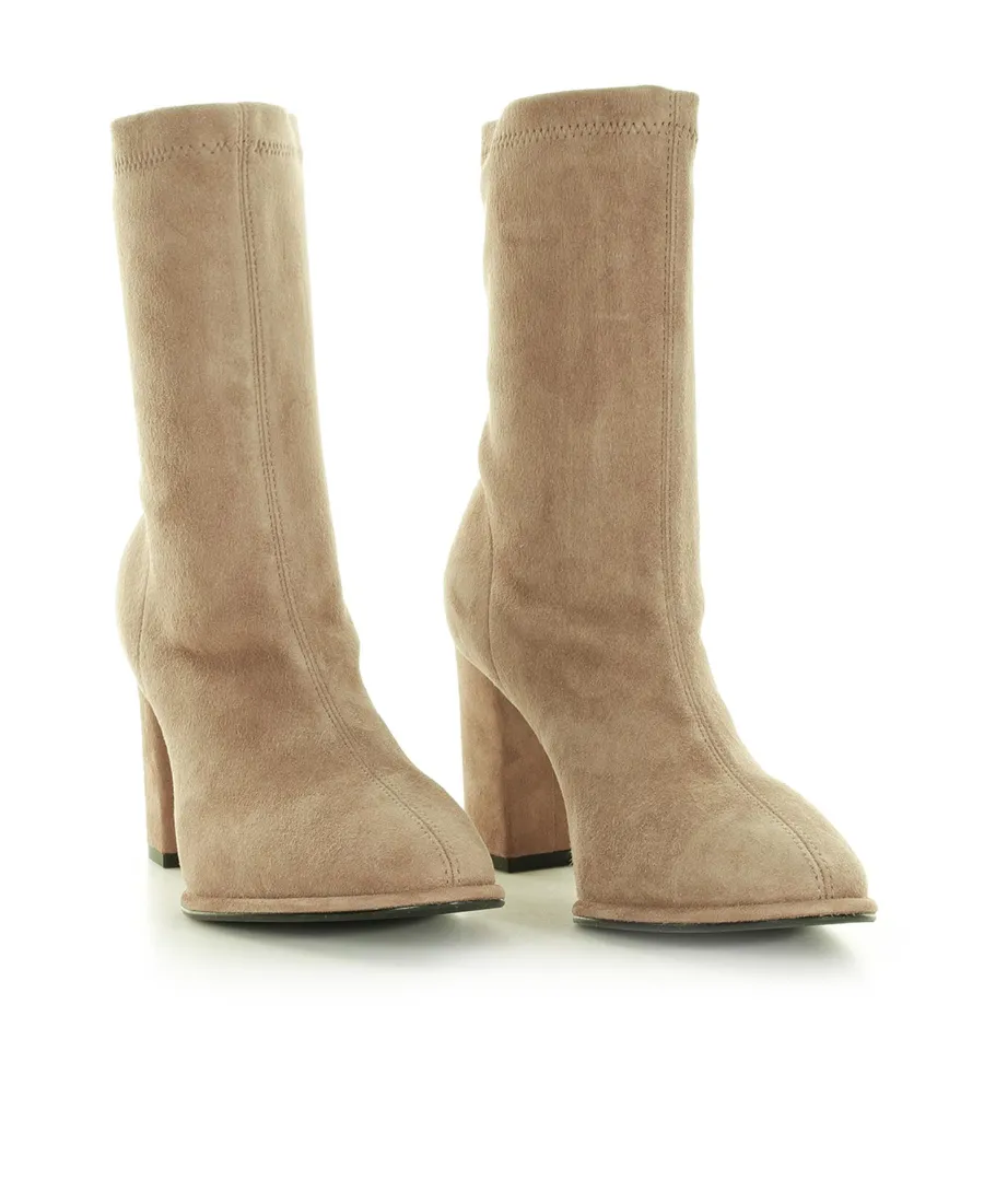 Suede leather and elasticized ankle boot with a pointed toe. Features a block heel and tonal stitching.