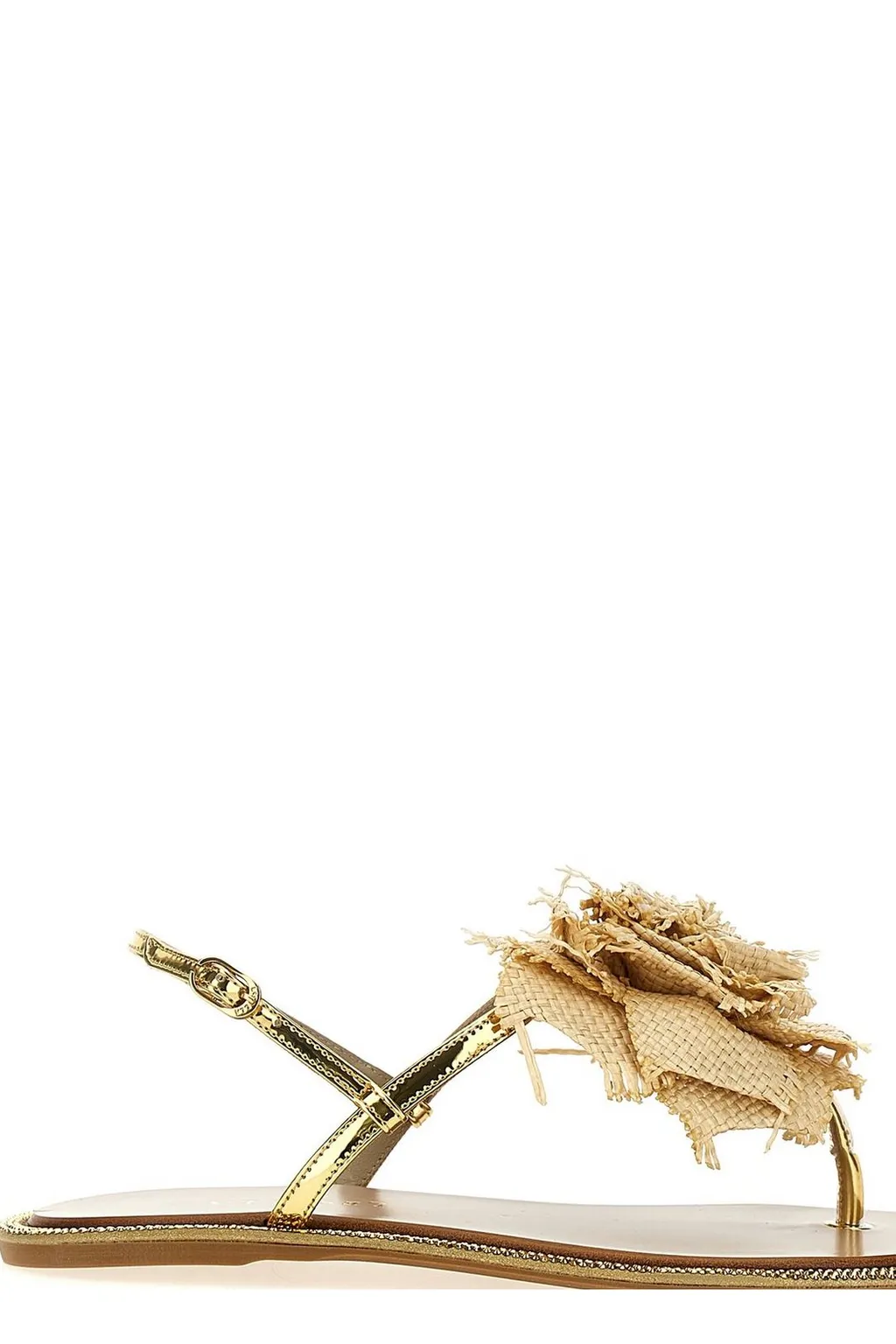 Gold thong sandals with a decorative raffia flower on the vamp. The sandals feature a thin ankle strap with a buckle closure and a delicate beaded trim along the sole.