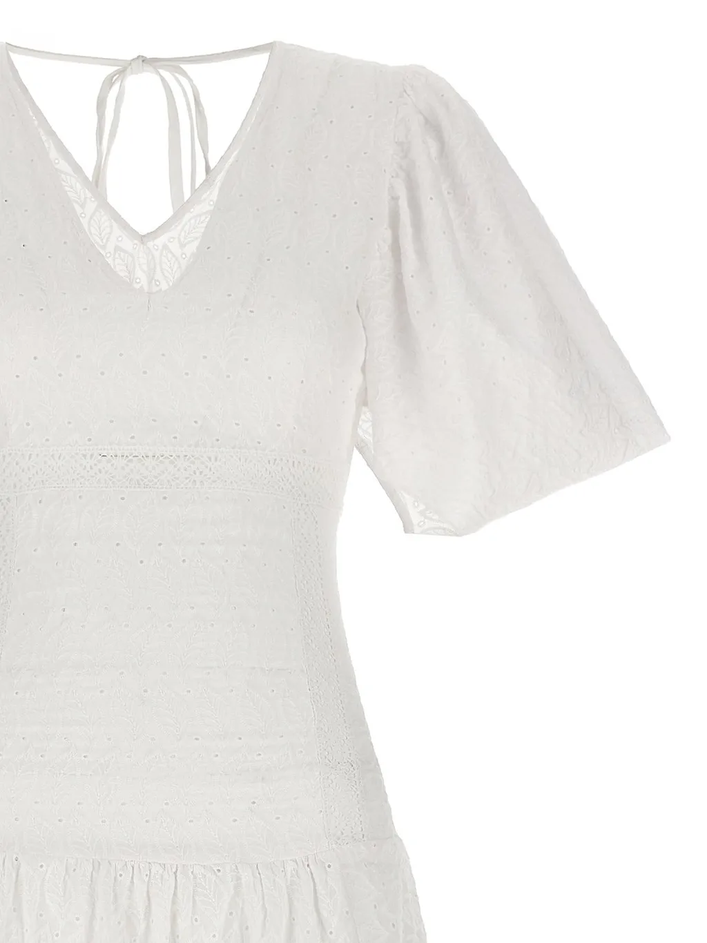 A white, ankle-length dress with short, puffed sleeves and a v-neckline. The dress features a smocked bodice and a tie closure at the back of the neck. The skirt is a-line and has eyelet detailing.
