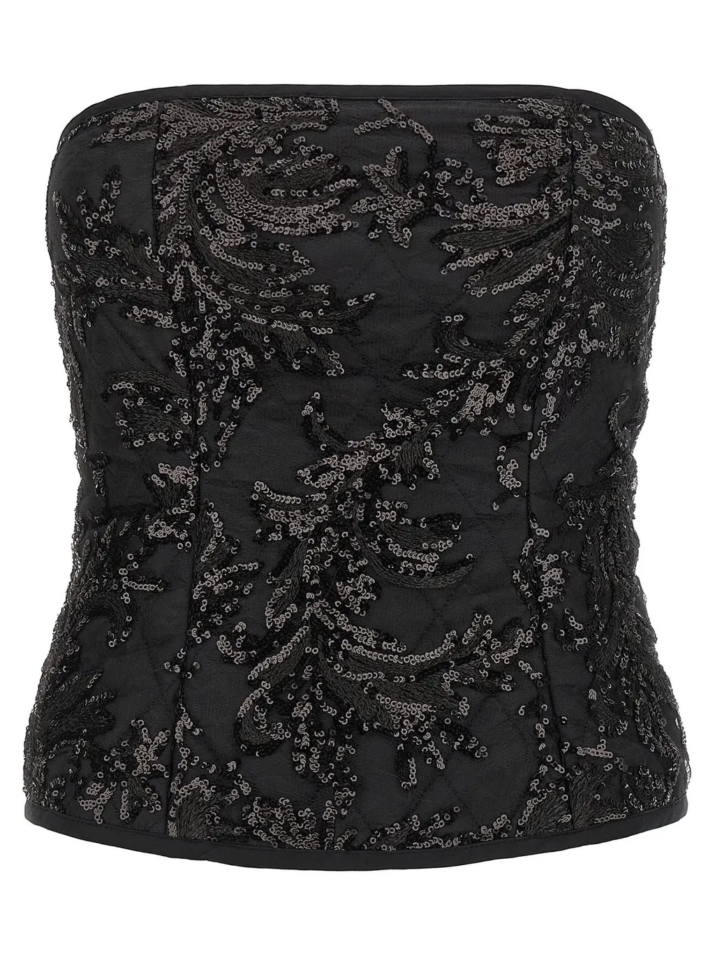 A black strapless corset top featuring an all-over sequin embellishment in a floral pattern. It has a structured bodice and a zip closure at the front.
