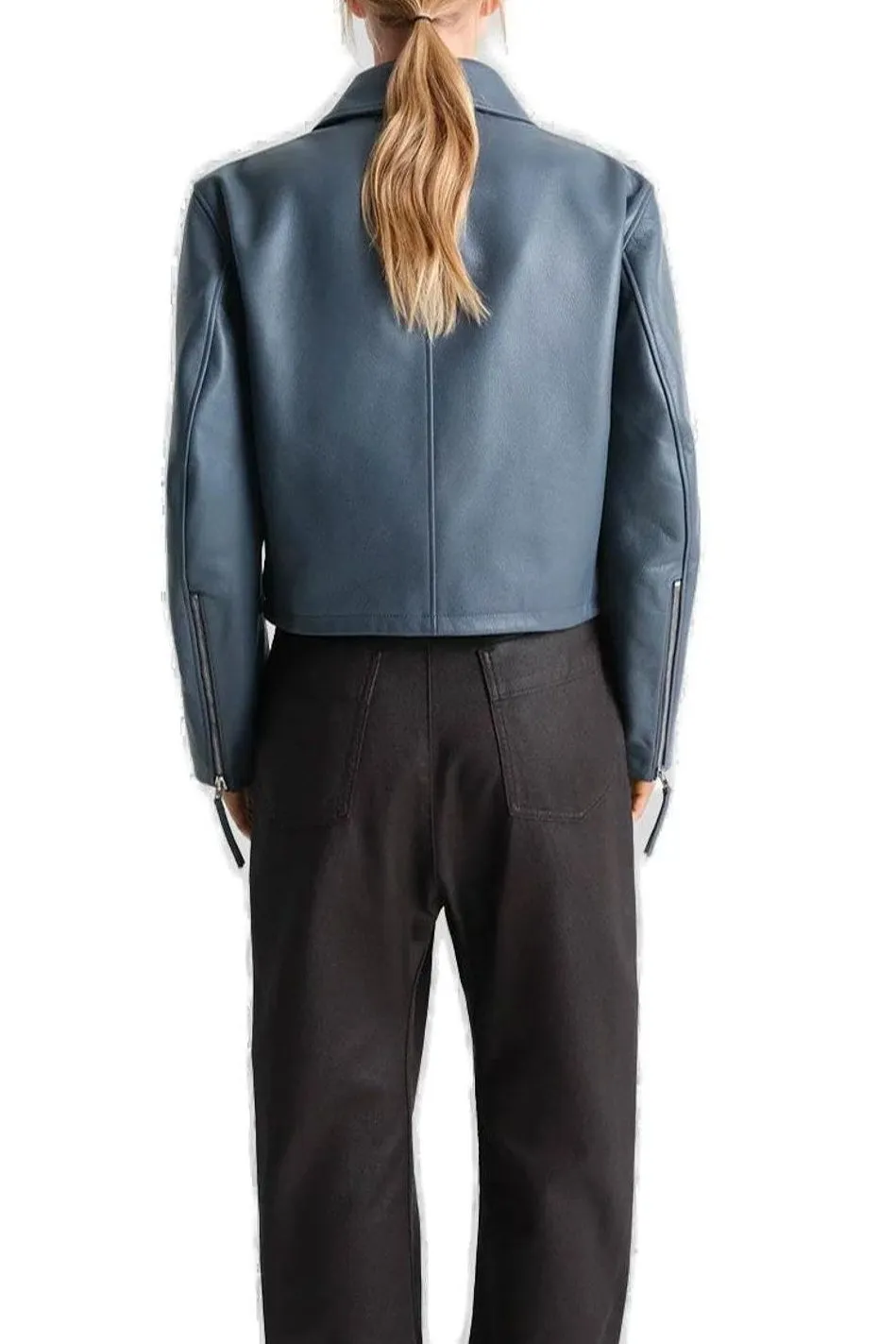 A cropped jacket with a pointed collar, front button closure, and long sleeves with zippered cuffs. The jacket is paired with wide-leg trousers.