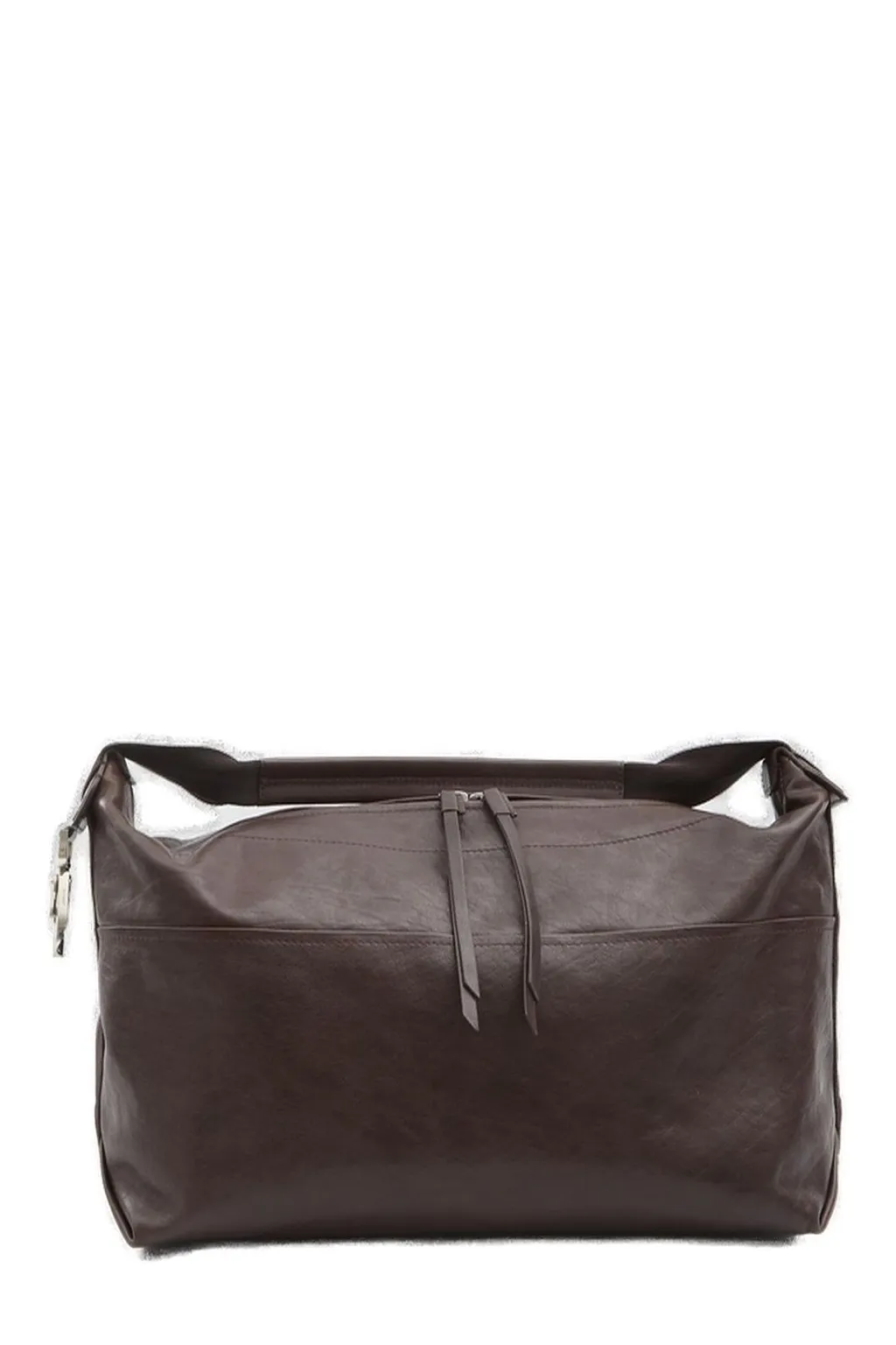DescriptionA large, unstructured hobo bag made of soft, dark brown leather. It features a single main compartment with a zip closure across the top. There are two exterior slip pockets on the front. The bag has two top handles and a detachable shoulder strap.