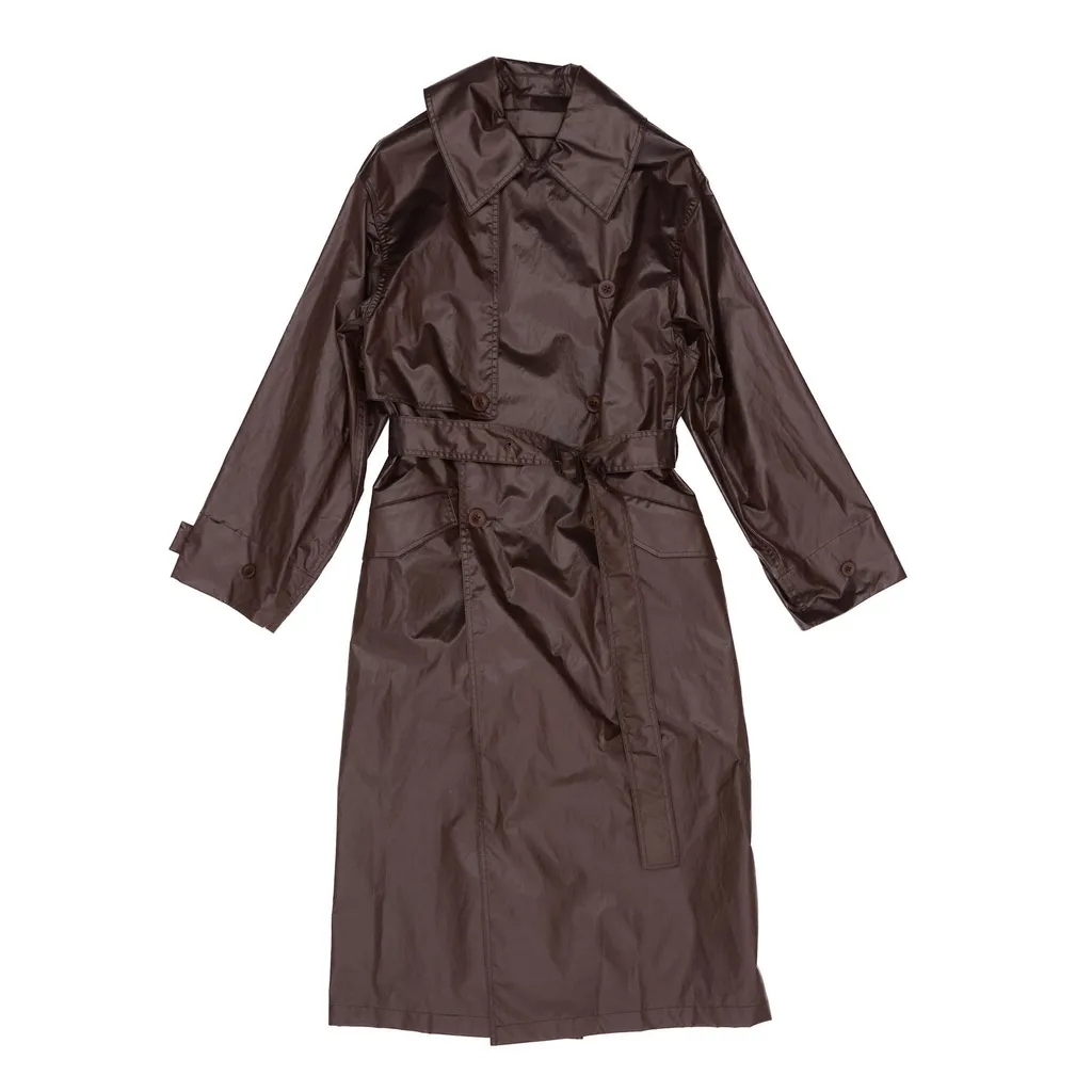 A long, brown trench coat with a belt at the waist and a classic collar. It features button closures and pockets. The material appears to be a shiny, possibly water-resistant fabric.
