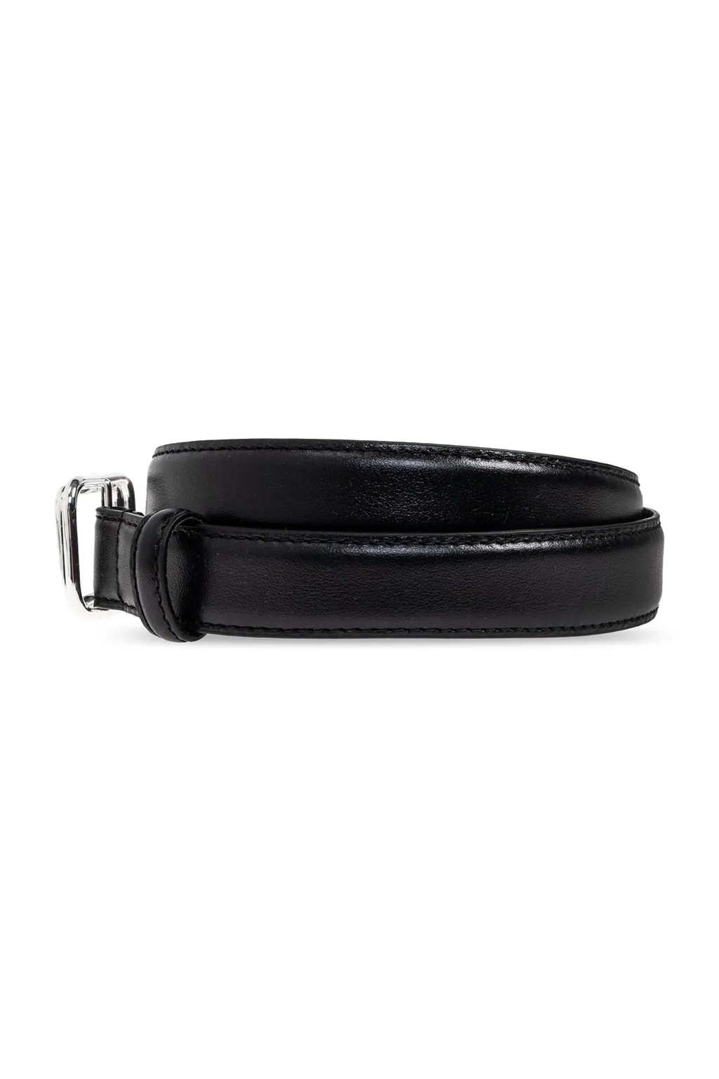 A classic black leather belt with a silver-toned buckle. The belt features a single keeper loop and a smooth finish.