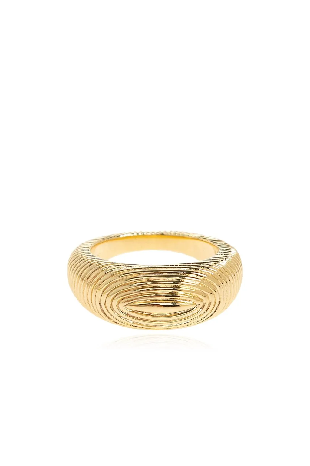 A domed ring with a textured surface that mimics the look of concentric lines. The center of the dome features an oval indentation with a subtle, eye-like shape.