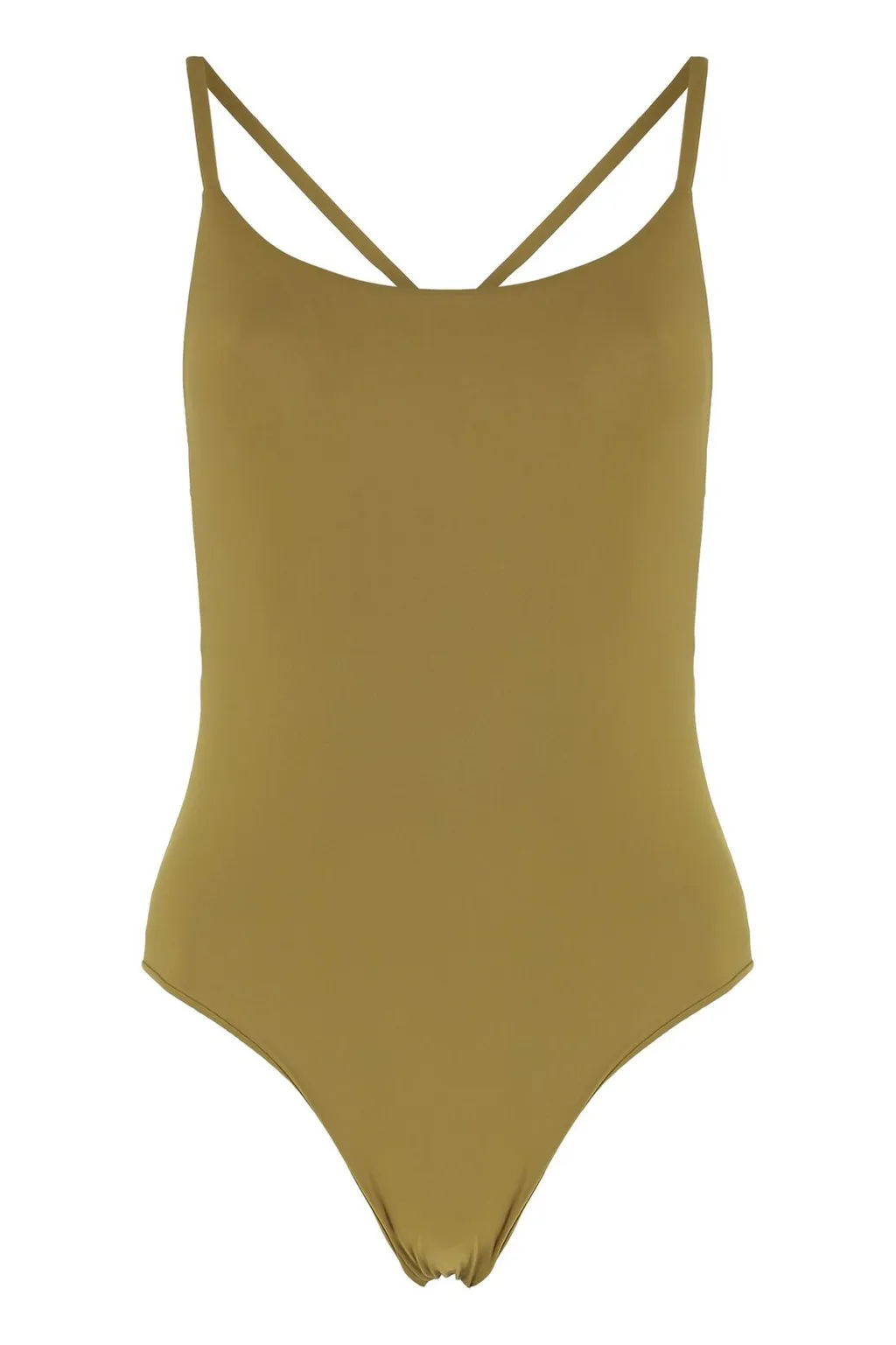 A one-piece swimsuit with a square neckline and criss-cross straps at the back. It has a high-cut leg opening and a low back.