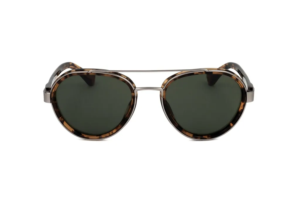 Aviator sunglasses with a double bridge and tortoiseshell acetate frames. The lenses are dark green and the frame is accented with silver-tone metal details.