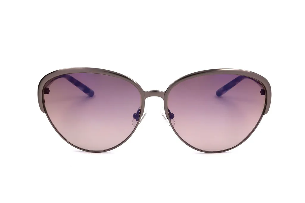 These sunglasses feature a cat-eye silhouette with a metal frame. The lenses are a gradient of purple and pink.