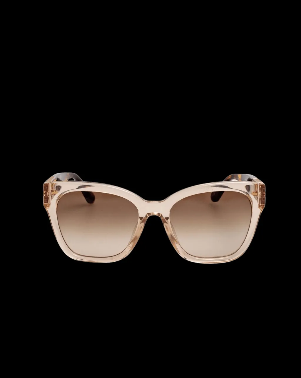 Oversized cat-eye sunglasses with a translucent beige acetate frame and gradient brown lenses.
