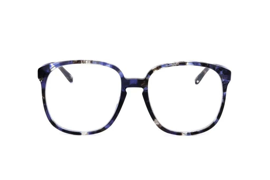 Oversized square eyeglasses with a blue tortoise shell acetate frame. The frame features a thick rim and a keyhole bridge. The temples are also made of acetate and match the frame's pattern.