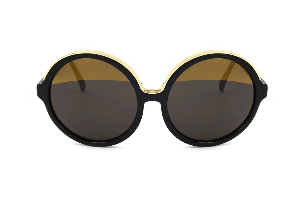 Oversized round sunglasses with a black acetate frame and gold trim. The lenses are brown.