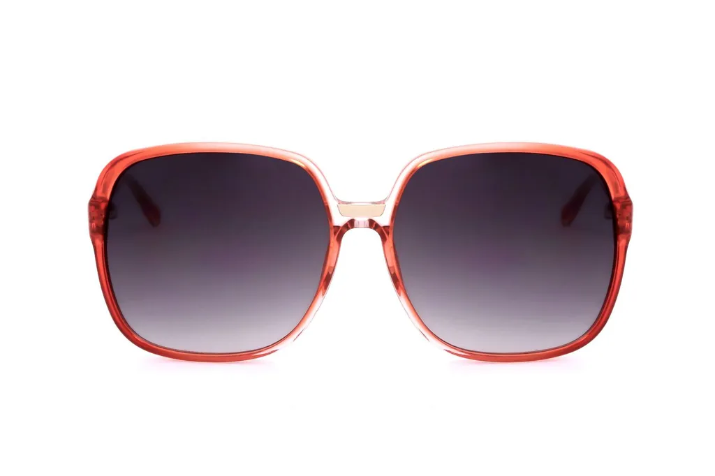 Oversized square sunglasses with a translucent red acetate frame. The lenses are a gradient of dark grey to light grey. The temples have a subtle textured pattern near the hinge.