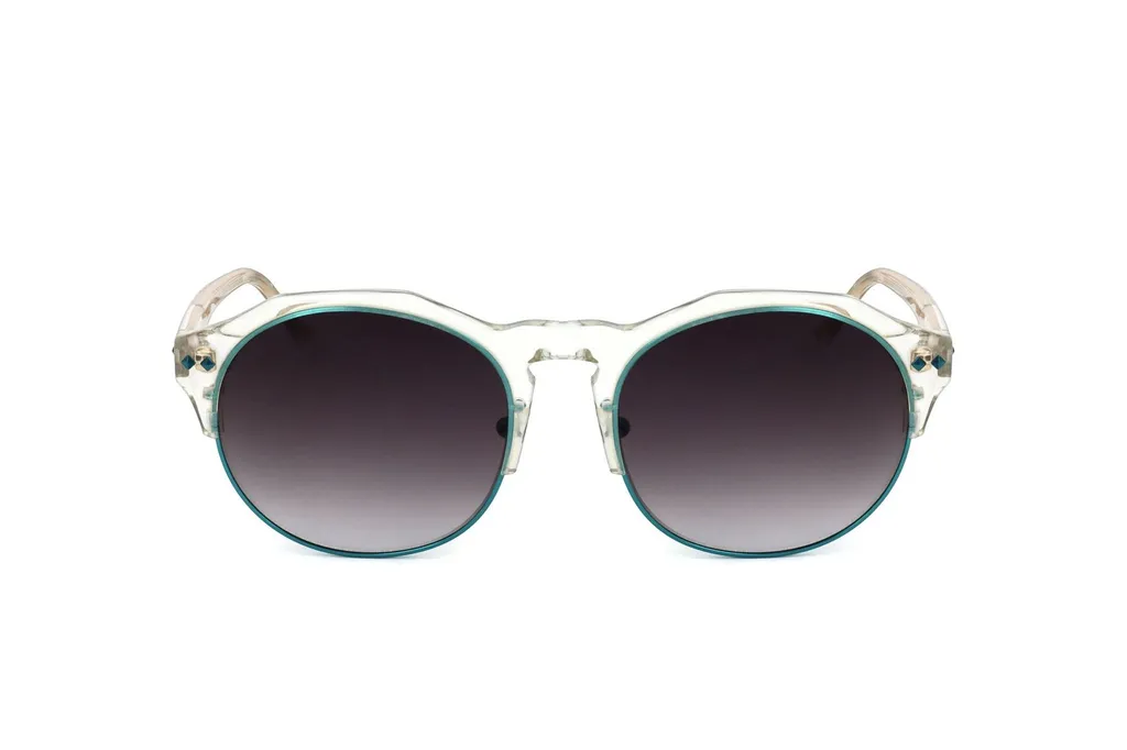 These sunglasses feature a transparent acetate frame with a subtle teal rim. The lenses are gradient grey, offering a stylish and functional accessory.