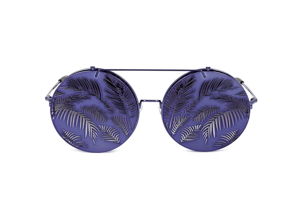 Round sunglasses with a metallic purple frame and lenses. The lenses feature an engraved palm leaf pattern. The frame has a double bridge design and thin temples with tortoiseshell tips.