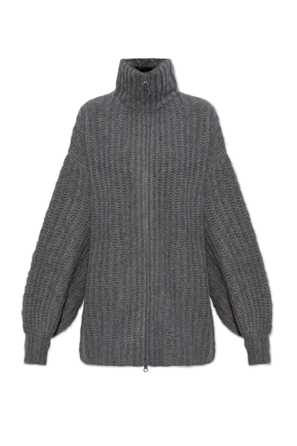 A grey, ribbed knit cardigan with a high, stand-up collar and a full-zip front closure. The cardigan features voluminous, balloon-style sleeves that taper into ribbed cuffs. The overall silhouette is relaxed and slightly oversized.