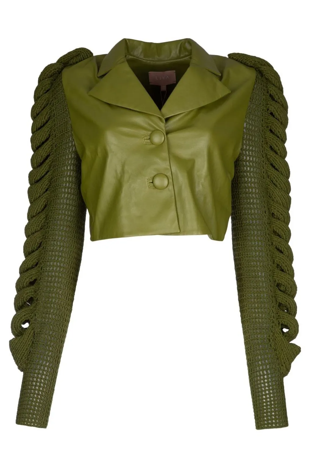 DescriptionA cropped jacket with a pointed collar and button-up closure. The jacket features long sleeves with intricate knitted detailing on the upper arms and shoulders, transitioning to a textured knit on the lower sleeves. The main body of the jacket appears to be made of a smooth material, possibly faux leather.