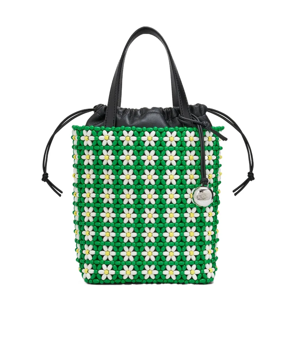 Mini tote bag in green beads and lambskin with a daisy motif. Features dual top handles and a drawstring closure.