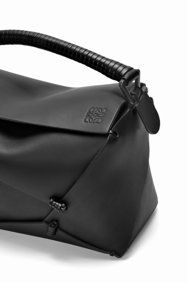 DescriptionThe puzzle bag is the debut bag for loewe by creative director jonathan anderson. This special edition created in collaboration with japanese bamboo artist hafu matsumoto is inspired by his sculpture practice, applying his signature technique of bending bamboo to bands of leather. This small version is crafted in calfskin, with a woven handle and knot details.