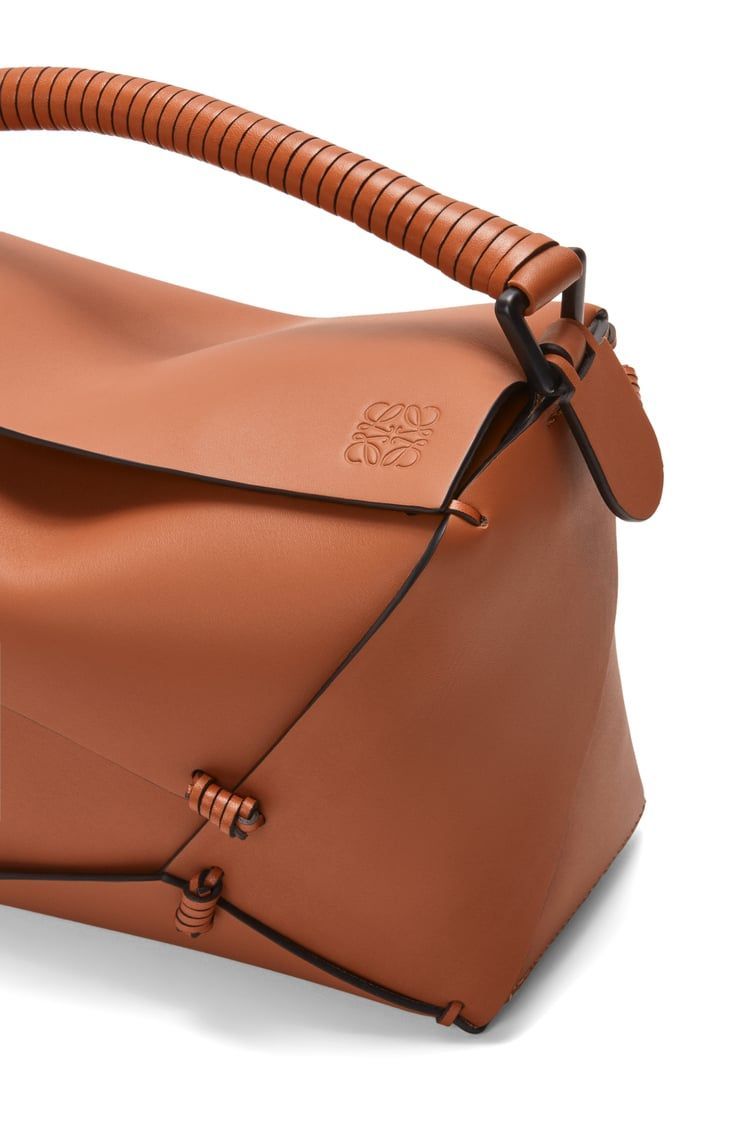 DescriptionThe puzzle bag is the debut bag for loewe by creative director jonathan anderson. This special edition created in collaboration with japanese bamboo artist hafu matsumoto is inspired by his sculpture practice, applying his signature technique of bending bamboo to bands of leather. This small version is crafted in calfskin, with a woven handle and knot details.