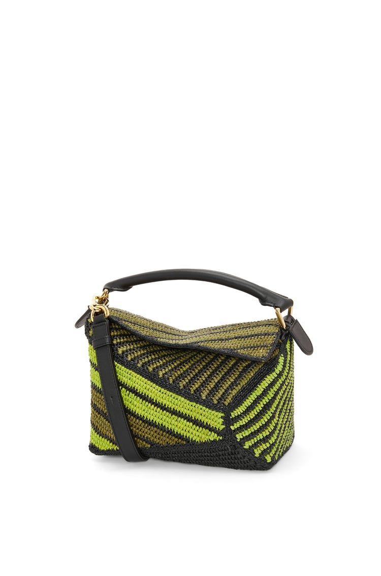 DescriptionThe puzzle bag is the debut bag for loewe by creative director jonathan anderson. A cuboid shape and precise cutting technique create puzzle’s distinctive geometric lines. This small version features a striped pattern and is made in spain using raffia leaves that have been cultivated, harvested, sun-dried and handwoven by artisans in madagascar