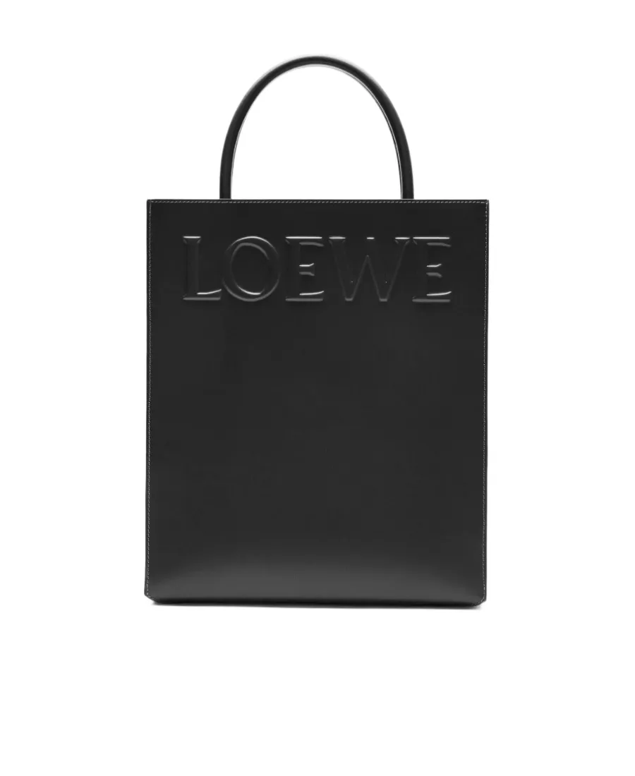 Logo shoulder bag with an embossed logo on the front, top handle, and adjustable and detachable shoulder straps.