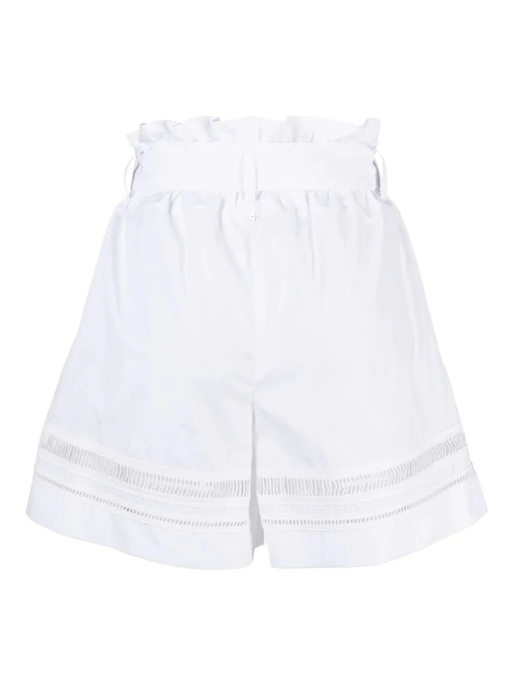 High-waisted shorts with a ruffled waistband and a matching fabric belt. Features decorative lace trim along the hem.