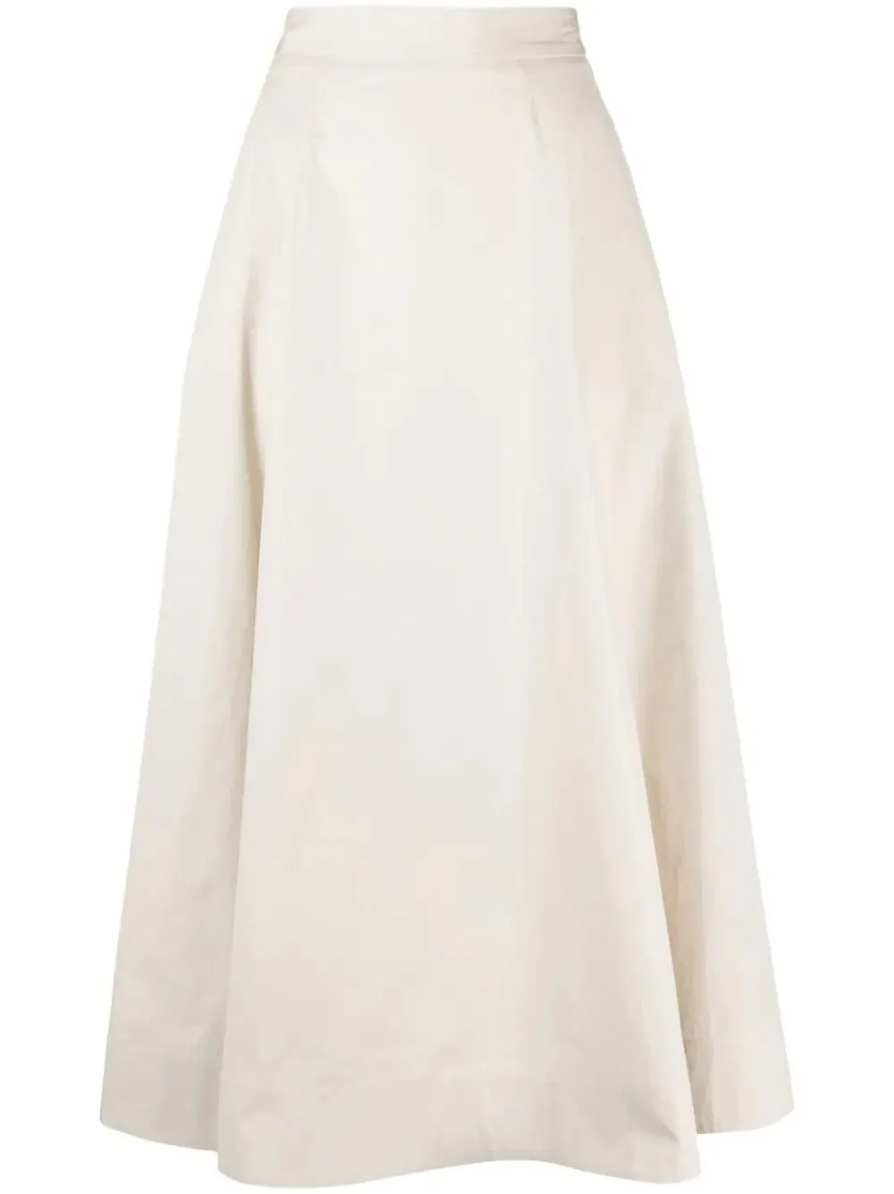A floor-length a-line skirt with a high waist and a subtle flare. The skirt is made from a structured fabric and features a clean finish with no visible embellishments or closures.