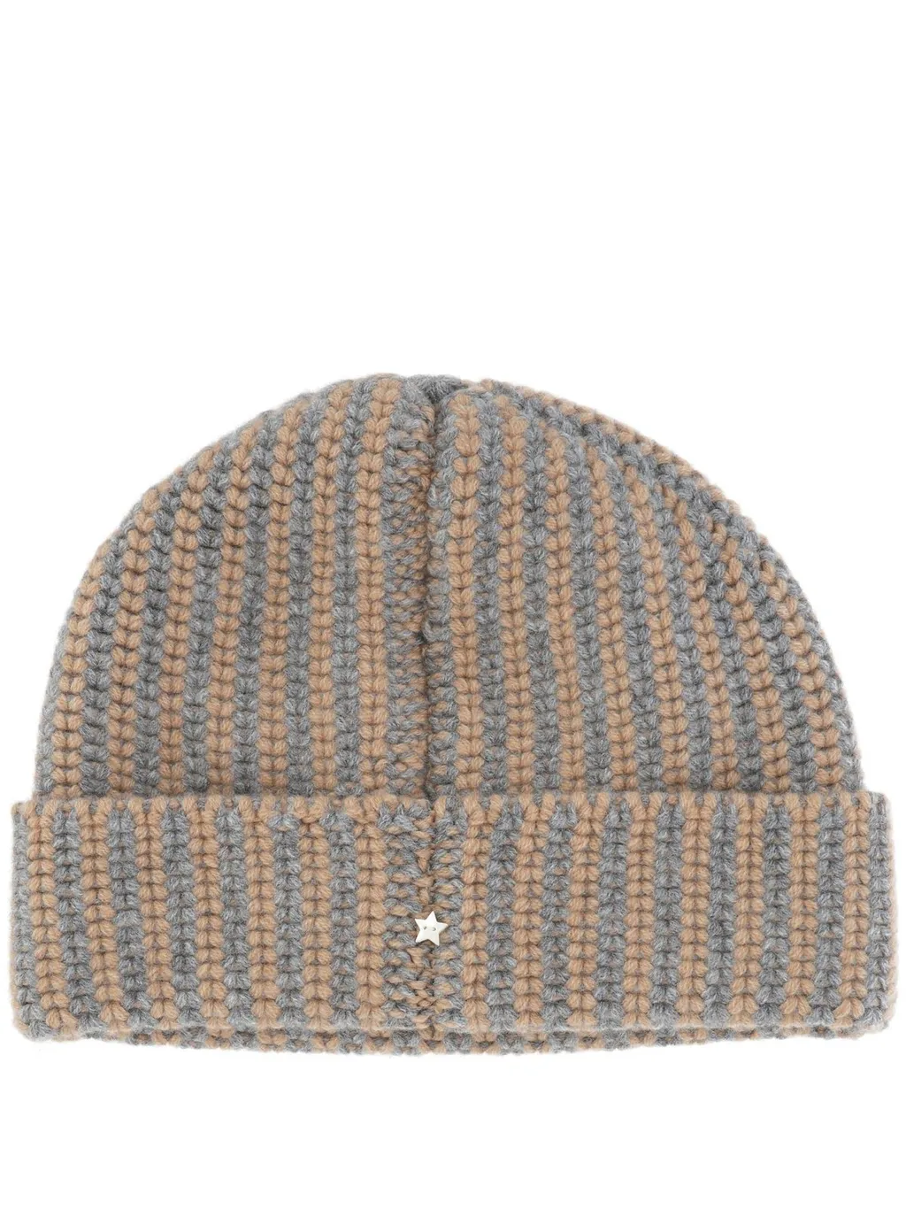 A ribbed knit beanie with alternating vertical stripes in grey and beige. It features a small, metallic star accent on the front.