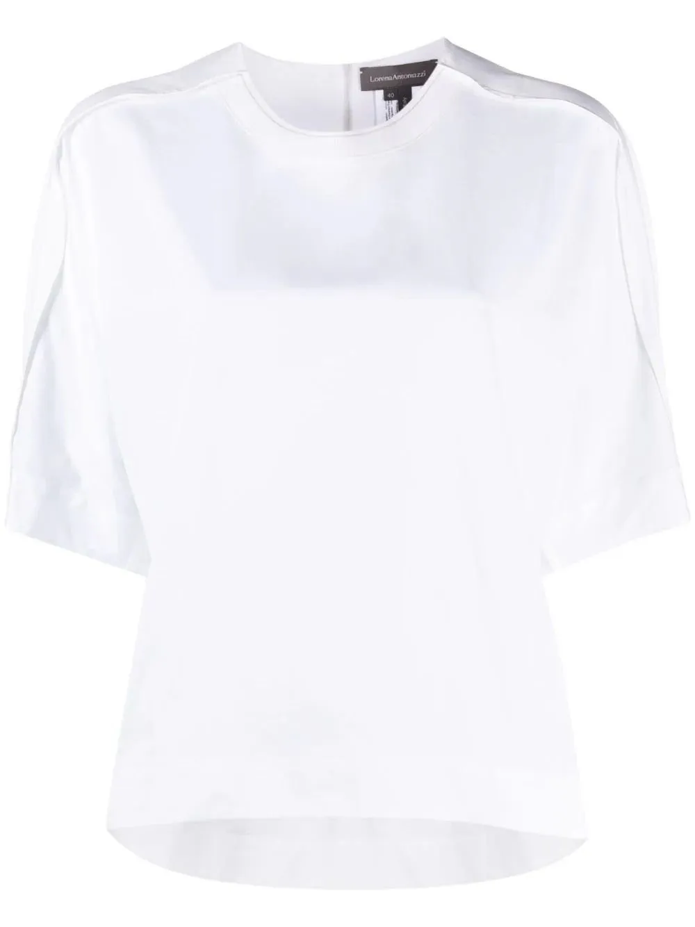 This is a short-sleeved white top. It has a crew neckline and a relaxed fit. The top has a zip closure at the back.