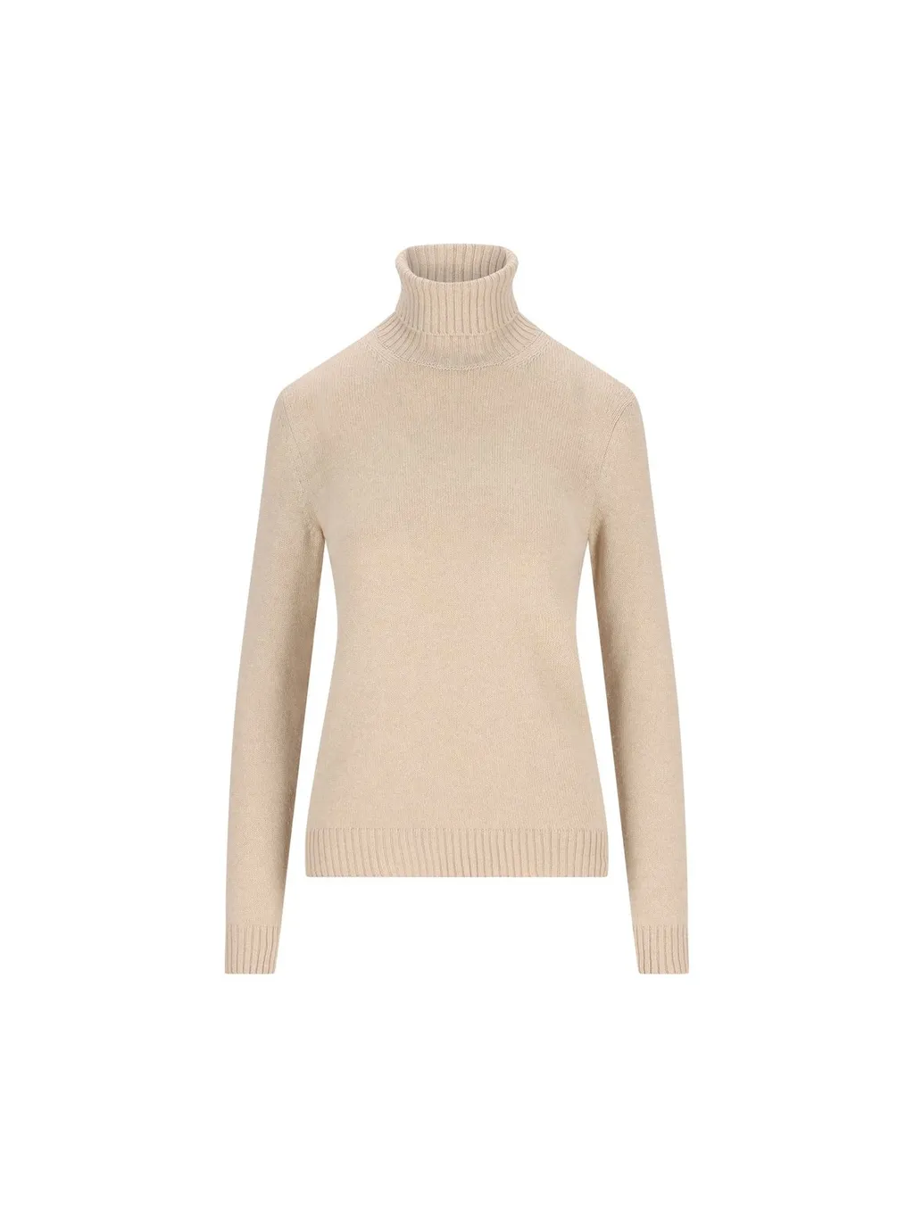 A classic beige turtleneck sweater with a ribbed texture on the collar, cuffs, and hem. It features a slim fit and long sleeves.