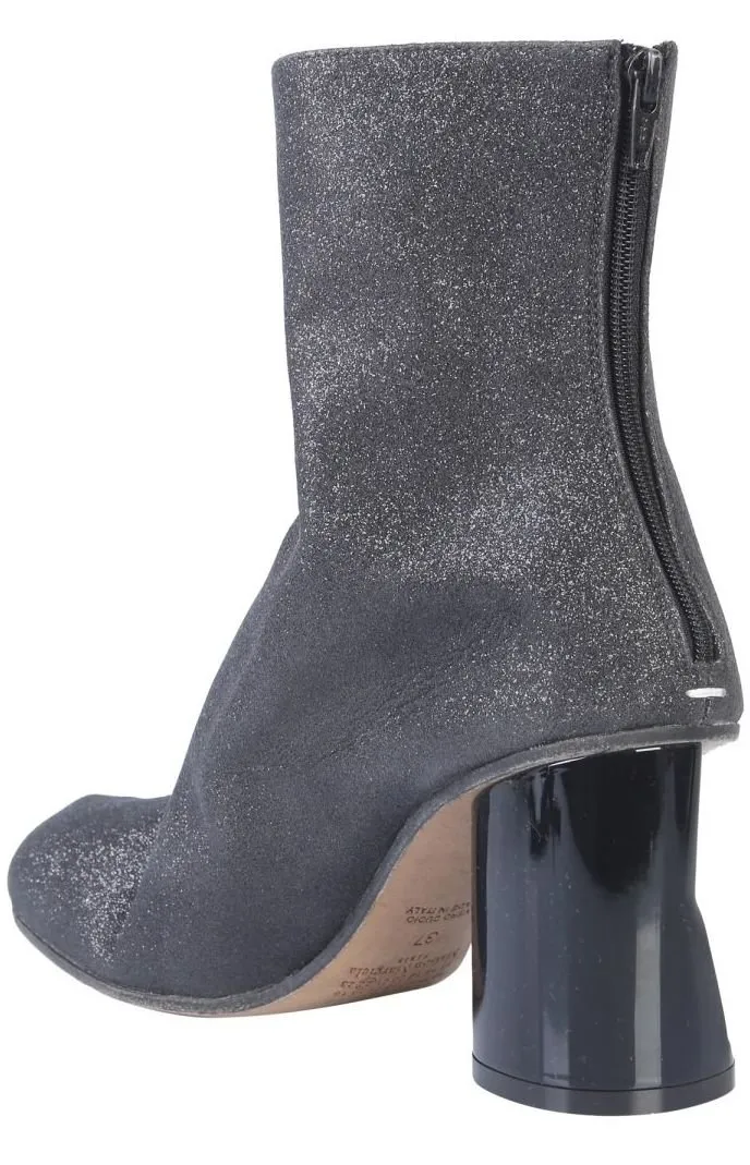 These ankle boots feature a glittery black upper with a pointed toe and a block heel. The heel is made of a shiny, faceted material. A zipper closure is present at the back of the boot.